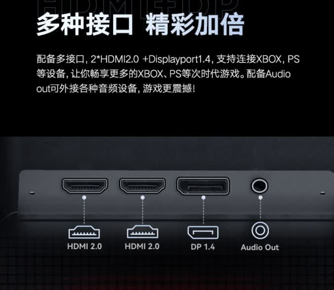接口方面,這款顯示器提供了HDMI 2.0和DP 1.4接口,以及3.5mm音頻接口,滿足玩家多設備連接的需求。同時,支持G-Sync和FreeSync技術,有效減少畫面撕裂和卡頓現象。還預設了多種遊戲輔助模式,包括FPS、RPG、RCG等,玩家可以根據不同的遊戲類型調整顯示器設置。