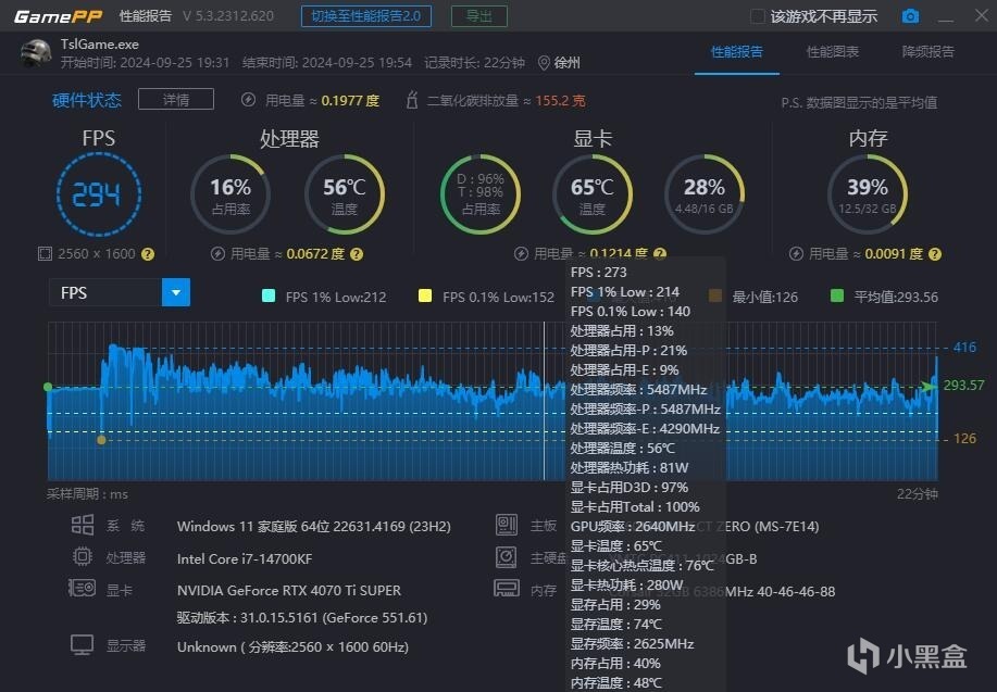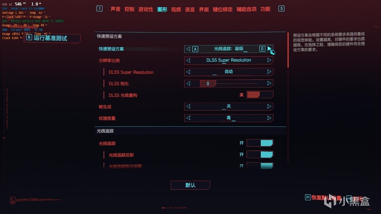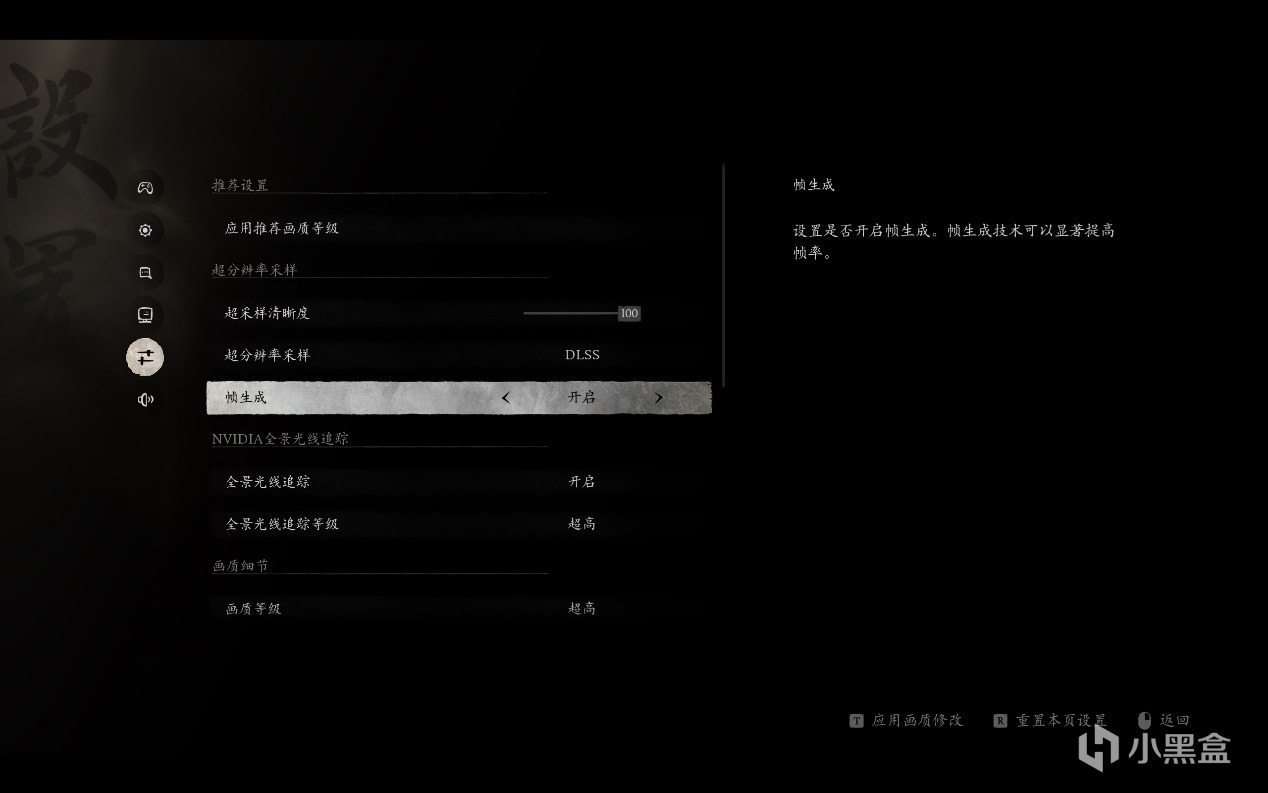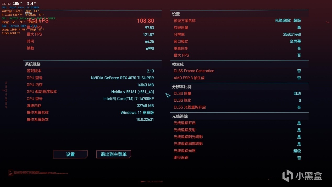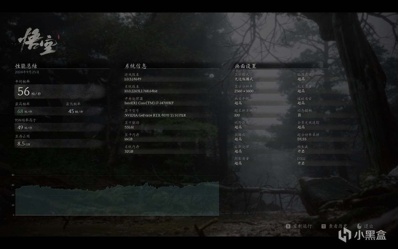 ▼游戏实测,先跑个黑神话悟空的测试,2K分辨率,超采100,光追超高、画质超高。