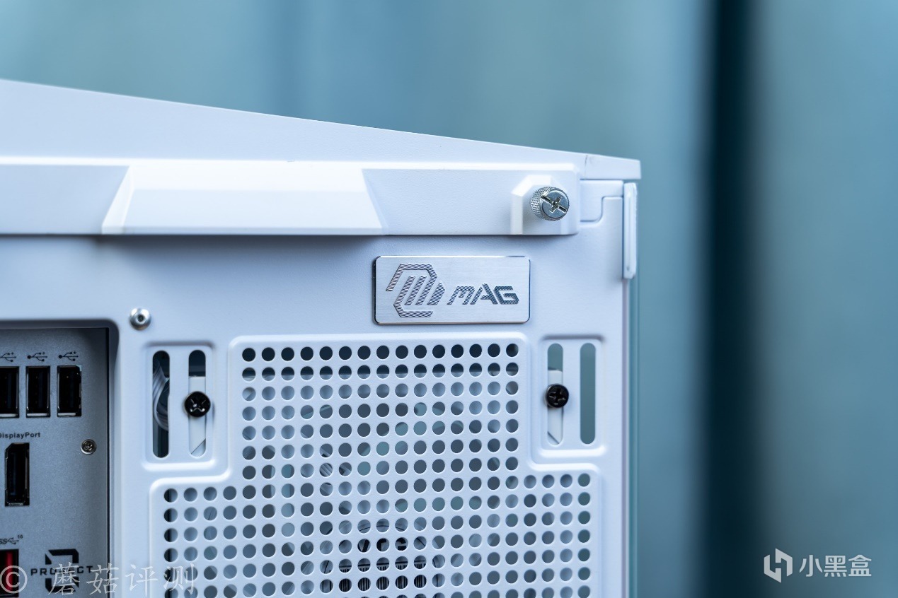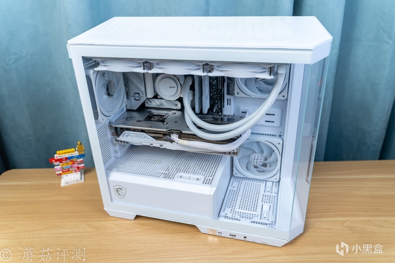 ▼机箱用的是微星自己的白刃机箱,侧透的玻璃采用硬朗的多边形设计,从机箱前侧45°角度看过去的效果更好。