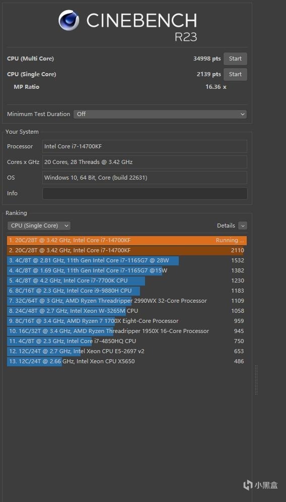 ▼跑个CineBench R23,单线程得分2139,多线程得分34998。