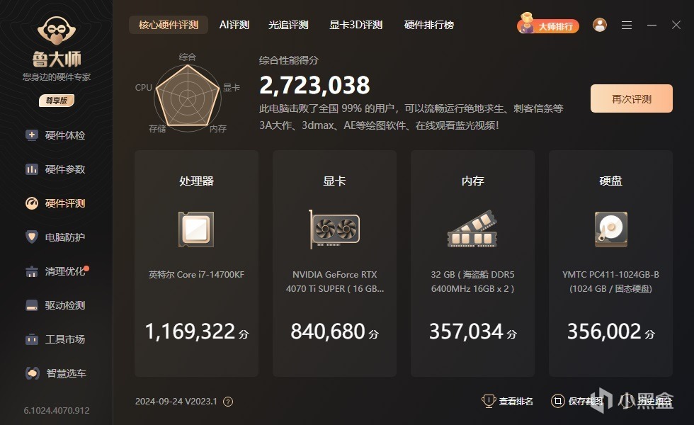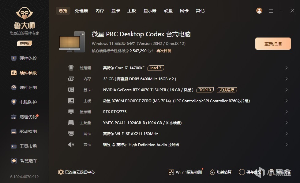 硬件配置方面,14700KF搭配RTX4070 Ti Super显卡的组合,性能非常强大,在2K分辨率下,市面上主流的大型3A、网游等基本通吃,毫无压力。另外,其所搭配的主板、显卡、水冷、电源等硬件,均为微星自家产品,且表现均非常不错。