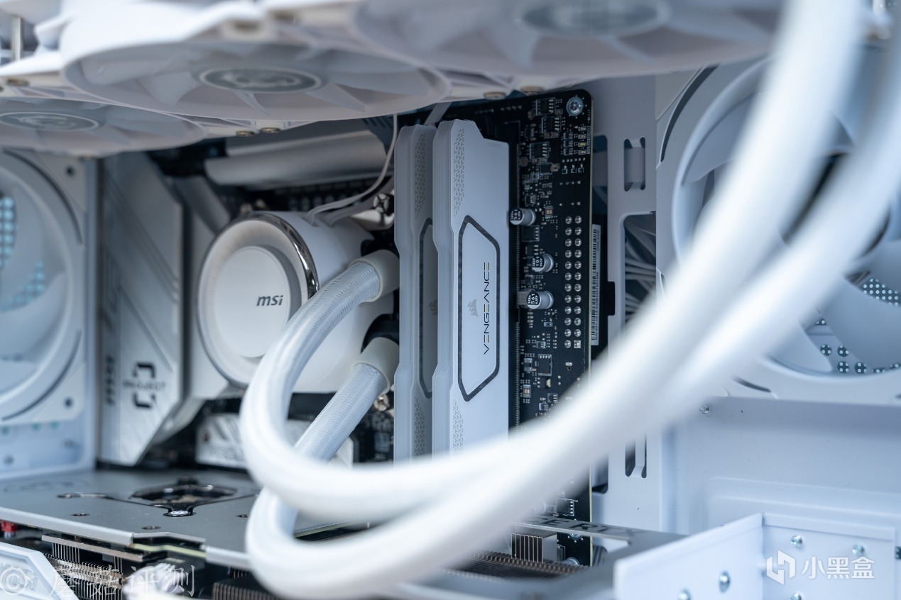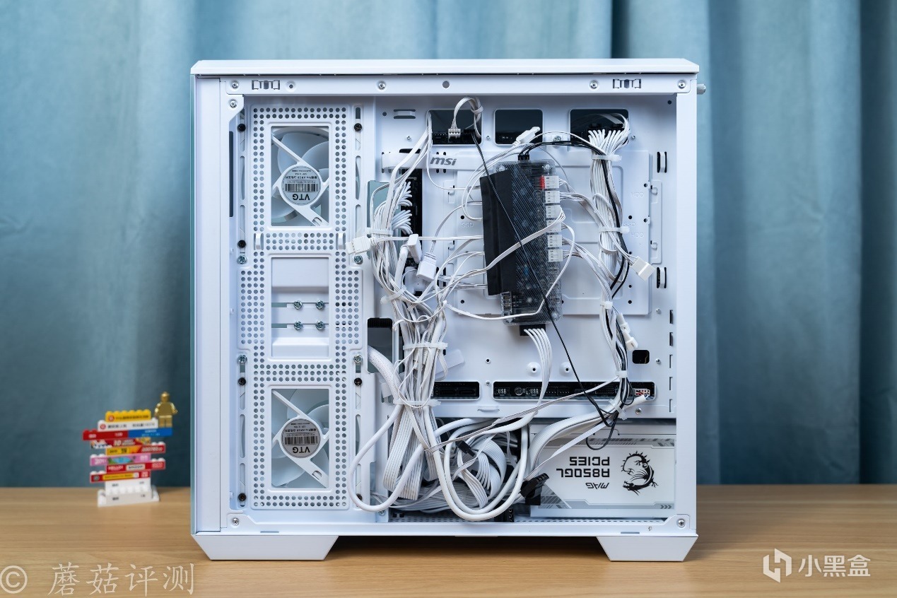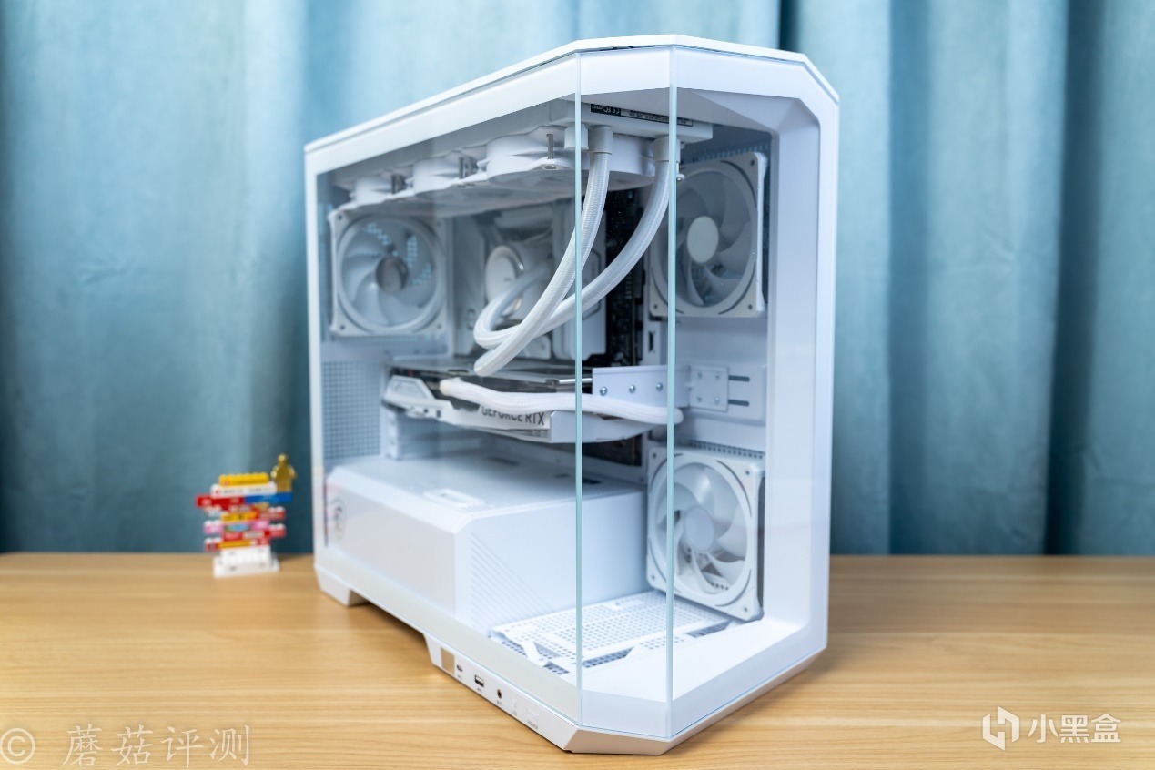 ▼这台主机采用了一块背插主板,正面除了水冷管和显卡供电线之外,再无其他线材,视觉观感非常的整洁。