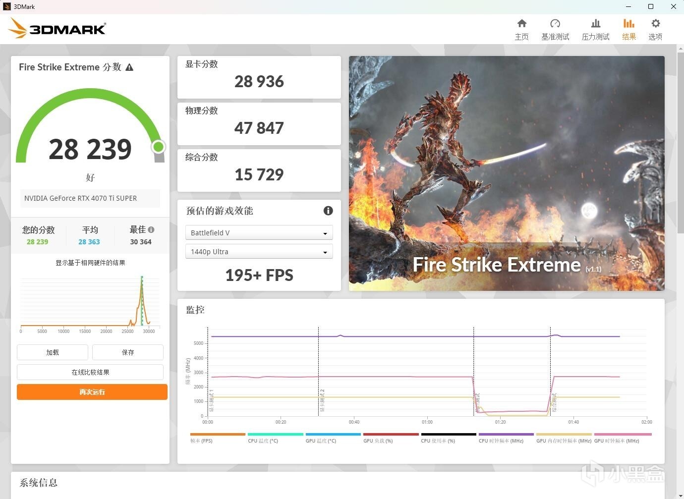 ▼跑个3Dmark的FSE测试,显卡单独得分28936,物理分数47847,分数很高。