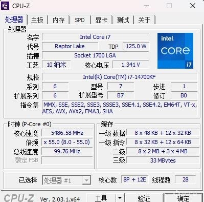 ▼简单看下CPU的硬件参数,这颗14700KF拥有8个大核、12个小核、28线程,三级缓存有33MB,最大睿频5.5GHz,非常给力。
