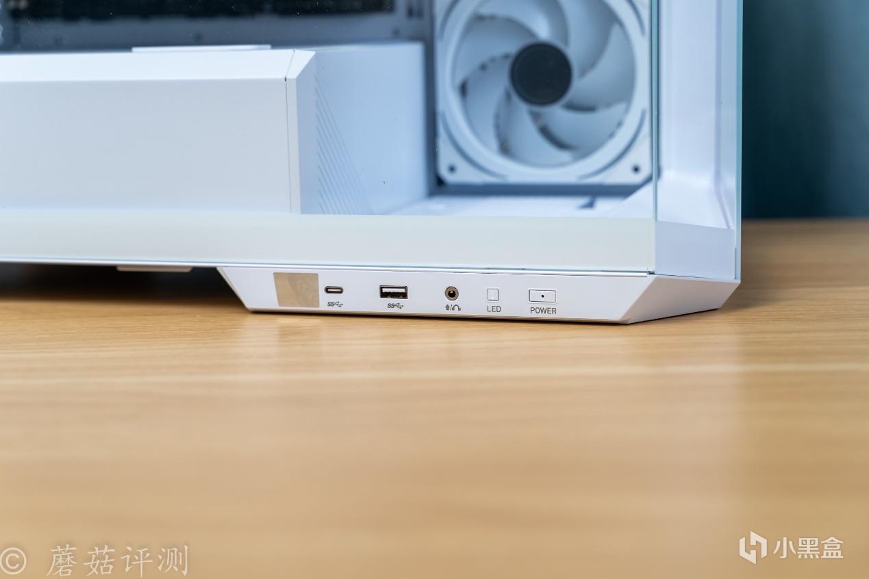 ▼右下角是机箱的IO面板,从右到左依次是开机键、LED灯效键、3.5mm音频插口、USB Type-A接口和Type-C接口,除此之外,最左侧还有一个Win标。