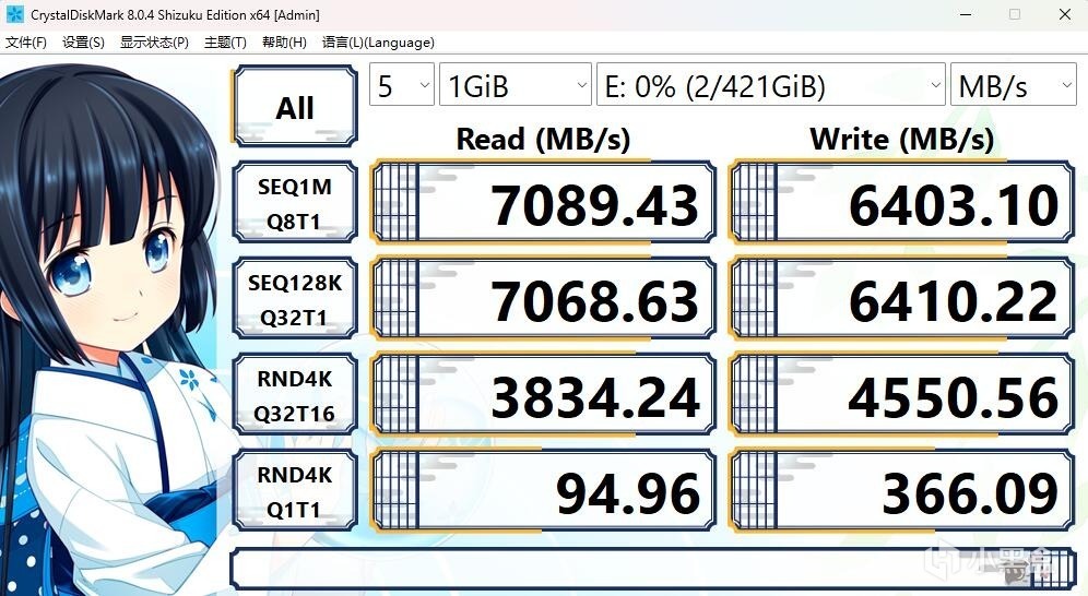▼简单跑个测试,顺序读取速度7089MB/s、写入速度6403MB/,速度非常快。4K读取速度94MB/s、写入366MB/s,表现不错。