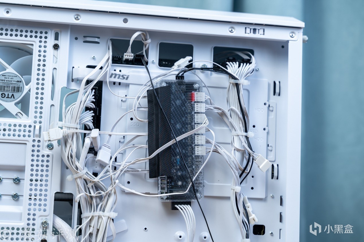 ▼不过在中间部分,增加了一个灯效、风扇HUB,另外在容易脱落的灯效插头部分使用了布基胶带辅助固定。