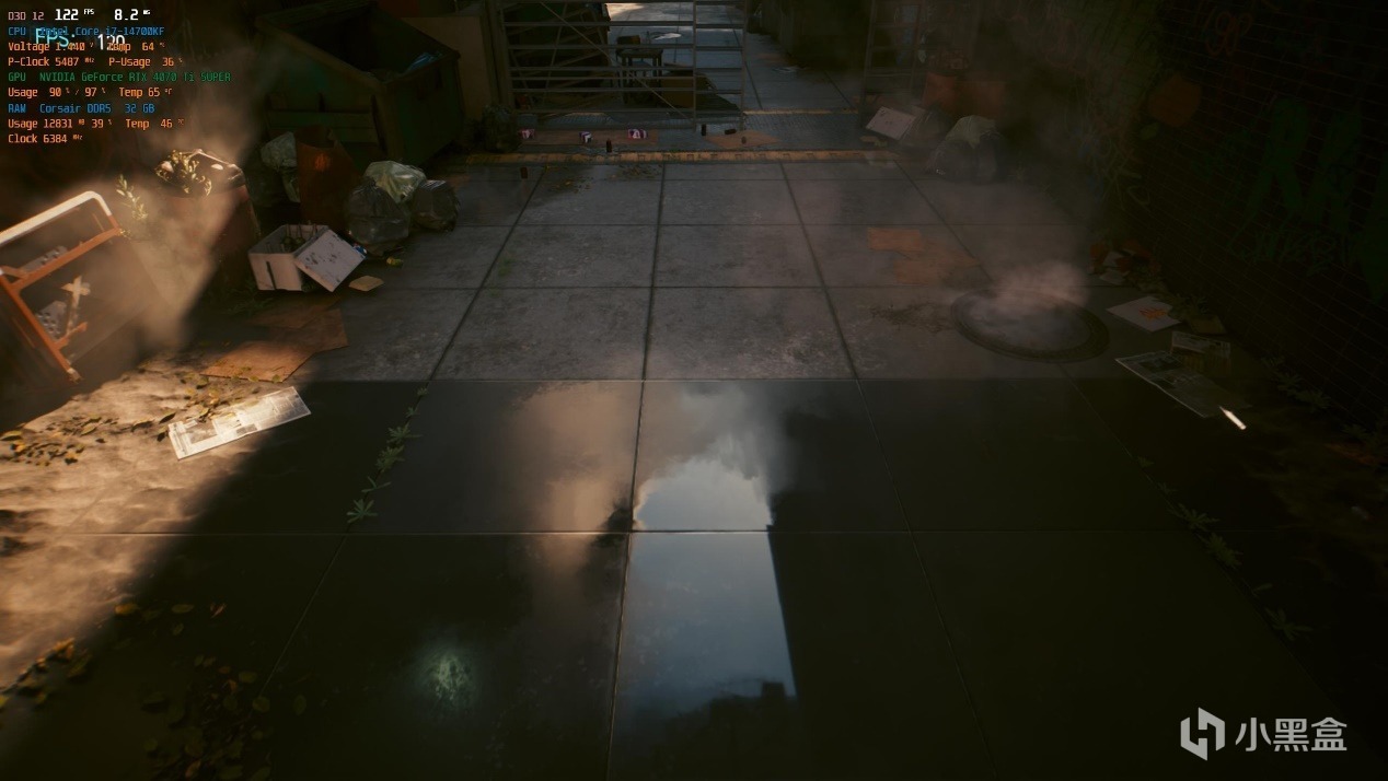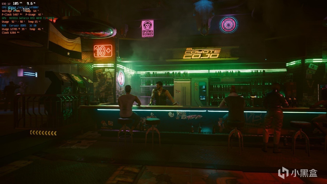 ▼酒吧吧台的光追特效非常棒,各种光影、雾非常漂亮,游戏帧数在105帧左右。