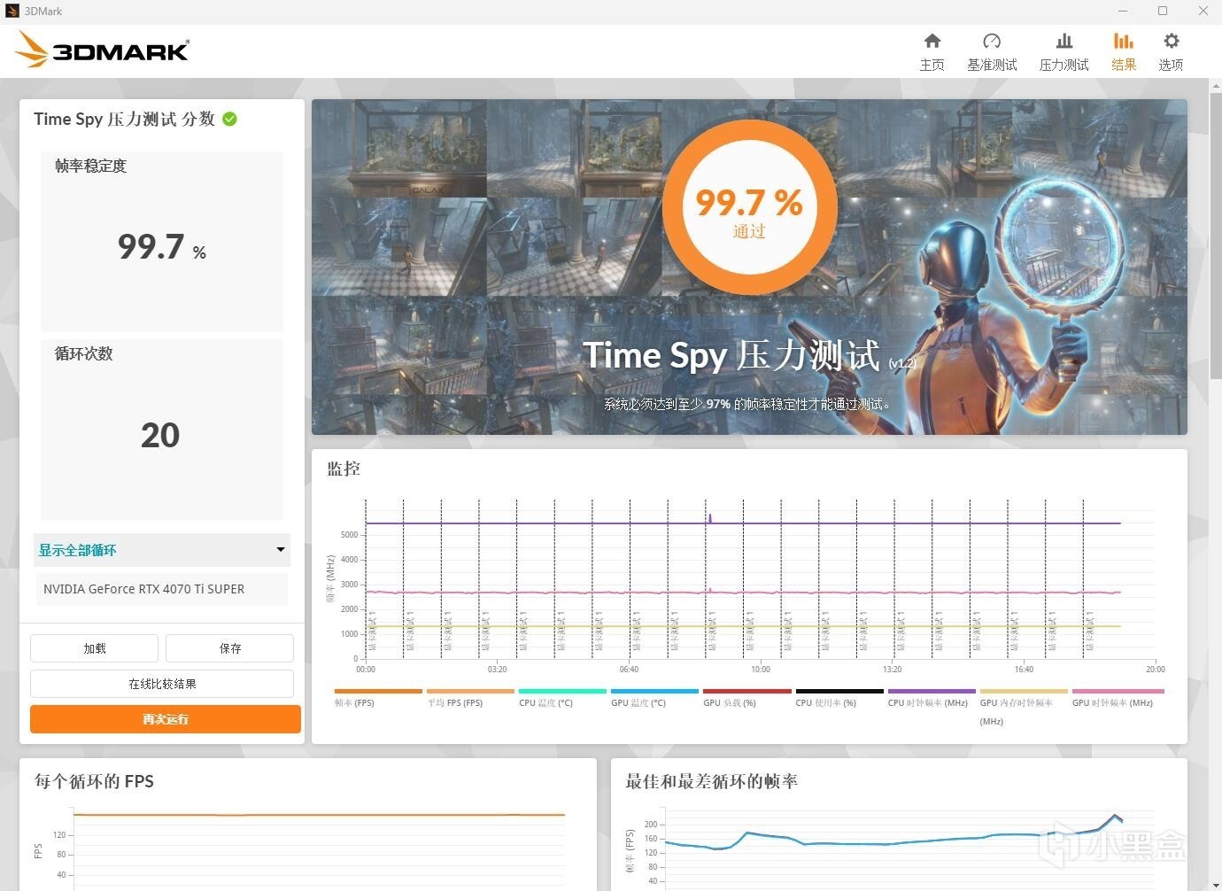 ▼跑个3Dmark的压力测试,TS模式,帧数稳定率在99.7%,非常稳定。