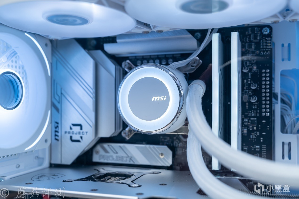 ▼水冷用的是微星的寒冰E360一体式水冷,这款水冷的水冷头整体采用白色配色,水冷头中间有圆环形的造型,旁边有微星的MSI的LOGO。