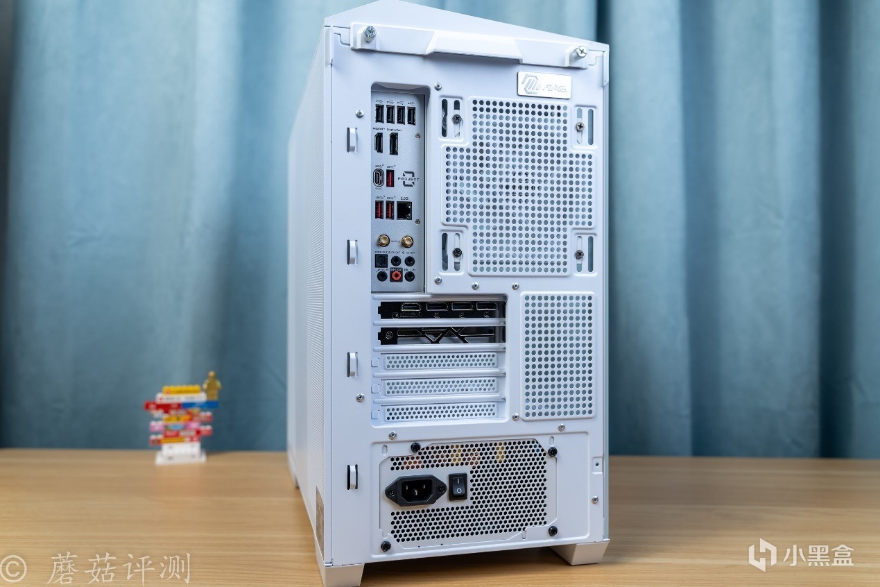 ▼机箱背面,上面是主板的IO接口,中间是显卡的视频输出接口,底部是电源。另外,电源也是白色的。