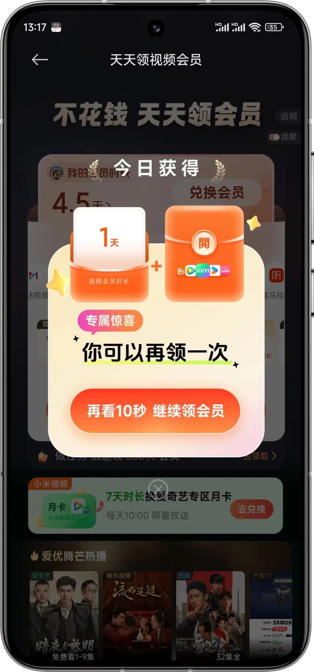 领取成功后,提示还能再看一次,不过第二次一般可领取0.5天左右的会员。
