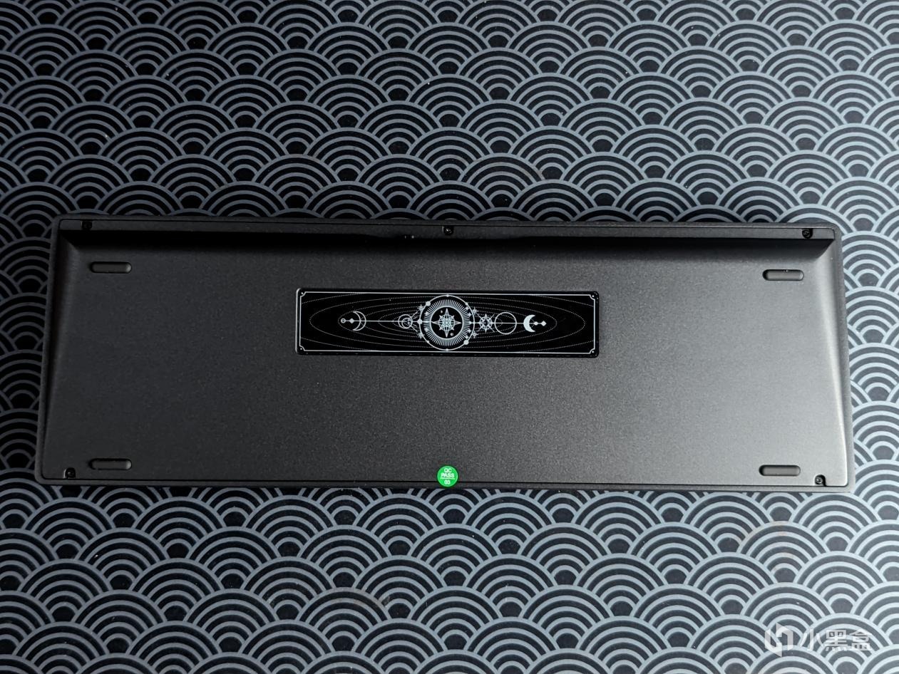 鍵盤背面則是四個防滑硅膠墊以及一塊亞克力裝飾銘牌,整體來說還算簡潔大氣,甚至沒有具體的參數銘牌,不過值得一提的是,其三模版本的套件以及成品都自帶有一塊8000毫安的大電池,基本可以滿足半個月的辦公需求了,如果不開燈的話,省着點一個月一充也不是夢想,畢竟其不是磁軸鍵盤,沒有那麼大的耗電量。