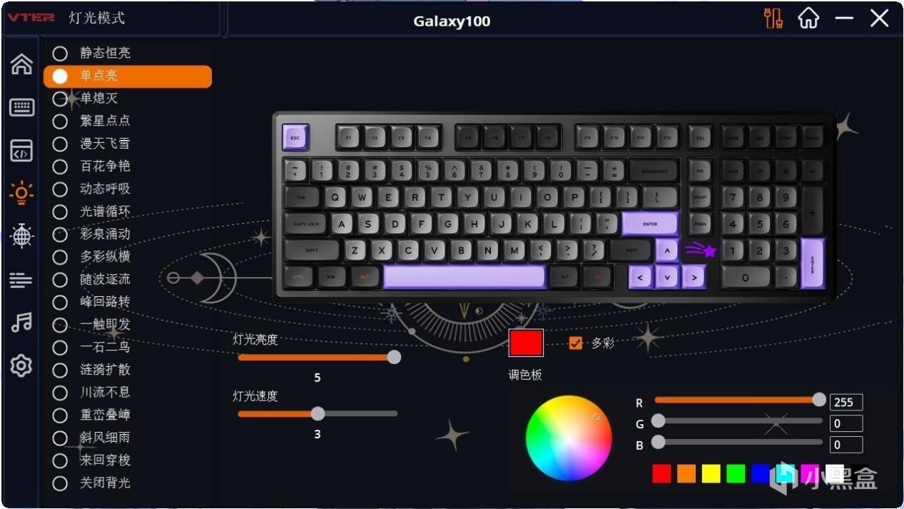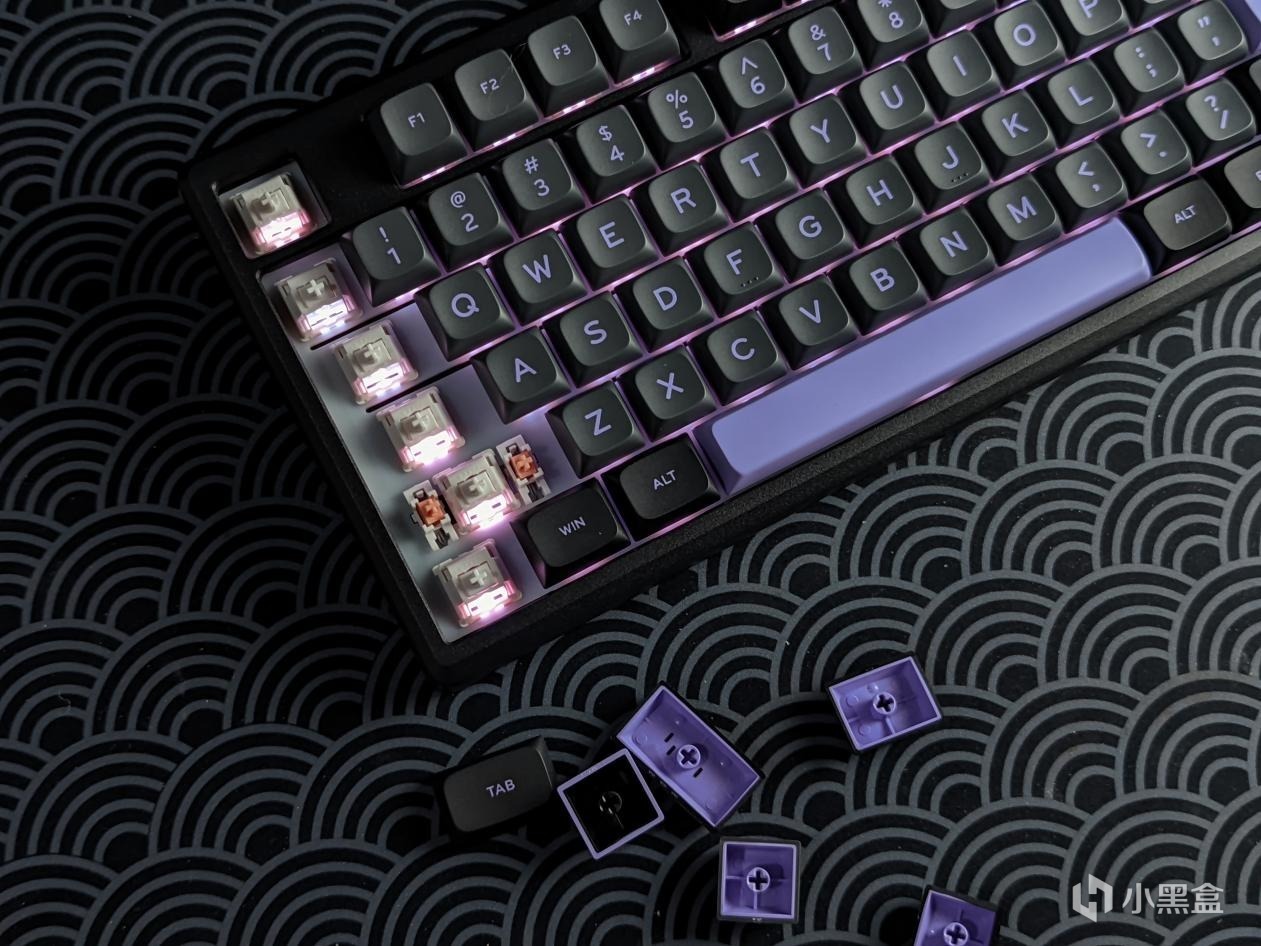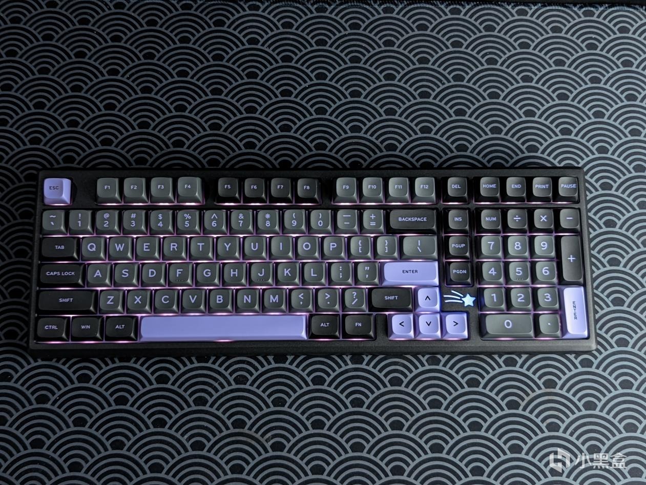 上機之後可以看到,Galaxy100採用的是下燈位設計,這對於側刻玩家來說是個好消息,畢竟上燈位如果用側刻,那大概率會很黑,而下燈位這部分就會好很多,至於鍵帽部分,VTER採用的是MDA高度的雙色注塑工藝的PBT鍵帽,手感還算乾爽,作爲一個和軸一起打包才貴三十塊的選項,其表現出乎我的意料。