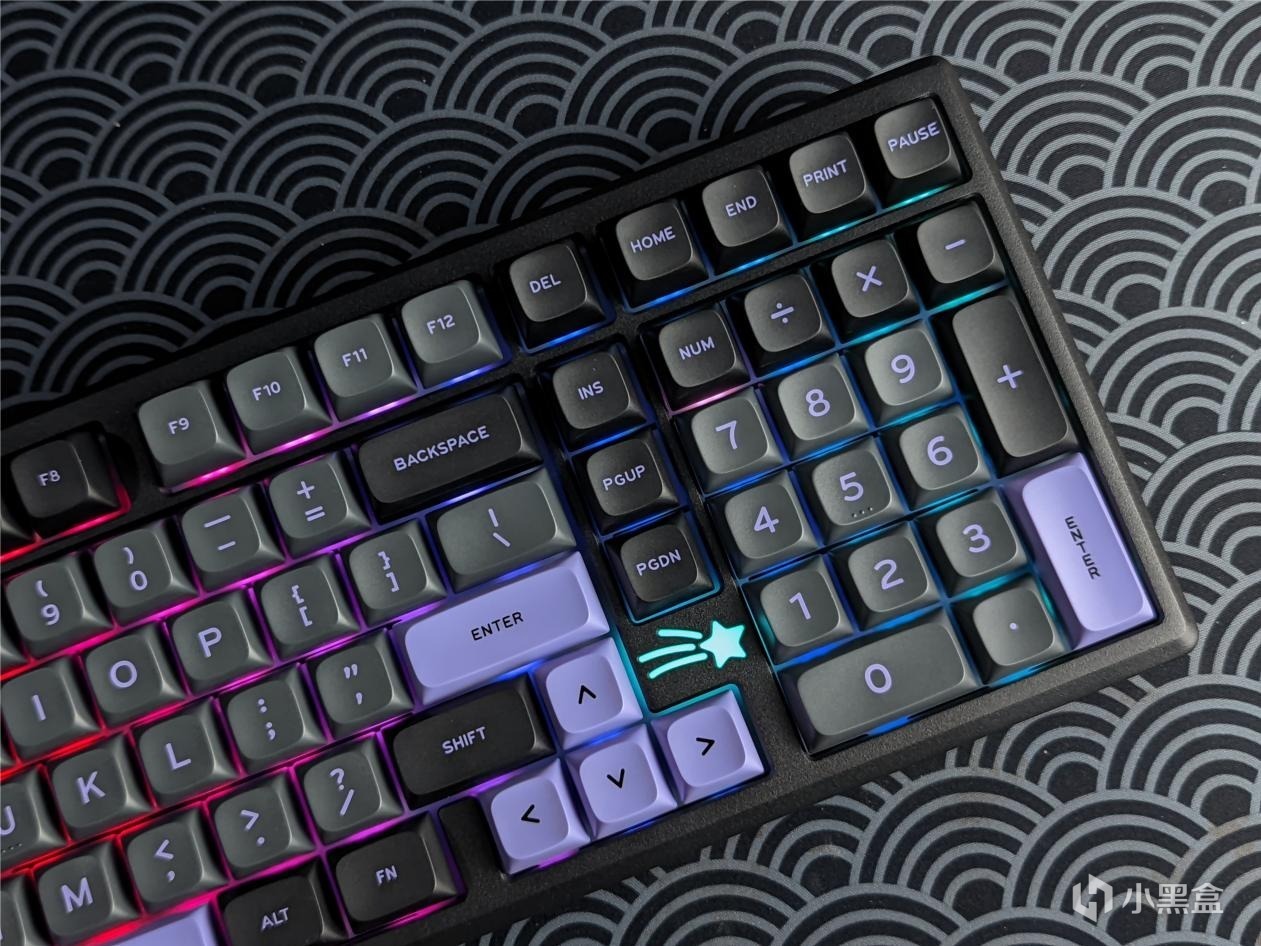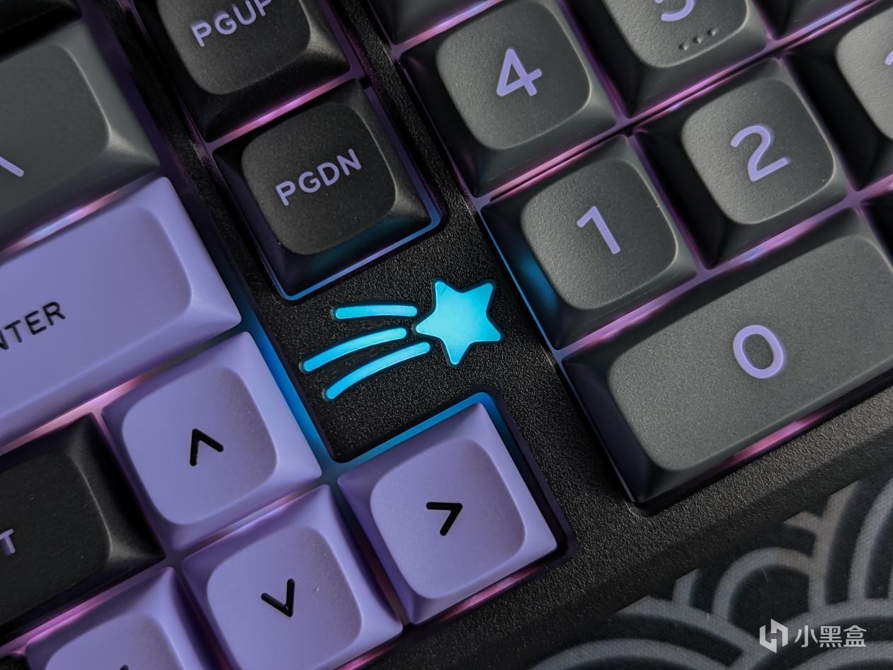 相信有細心的老哥發現了,這次的小流星是會發光的,沒錯Galaxy100的圖標位從接收器收納倉變成了一個帶有RGB的呼吸燈設計,顏值方面還是非常頂的,就是比較尷尬的是鍵盤本身並沒有做額外的收納倉設計,所以可能需要你自己找個地方放好接收器,順帶一提,其雖然是98配列,但採用的是2U0的設計,對於大部分金融行業的用戶絕對算是個好消息,畢竟1U0在快速使用小鍵盤的時候絕不是一個好選擇,並且方向鍵也沒有做下沉設計,絕贊!