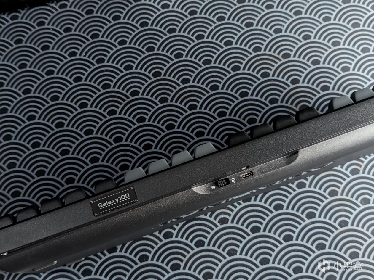 鍵盤的頂部看似只有兩個主要部分,但實際上是有三個,除去三模切換撥杆以及USB-C的數據口外,鍵盤側邊的帶有Galaxy100名稱的小銘牌,其實並不是裝飾作用,其所在的位置是獨立的外置天線,沒錯,還整上天線了,其功能就是使得無線接收器的信號更加穩定,保證使用體驗更加流暢。
