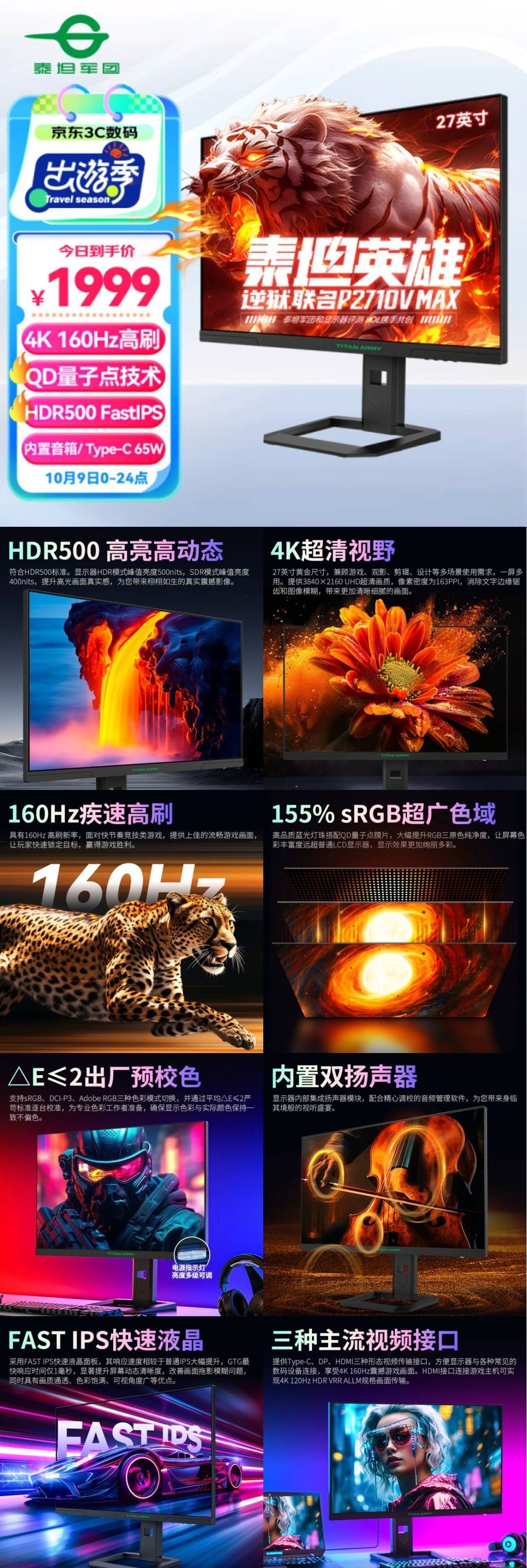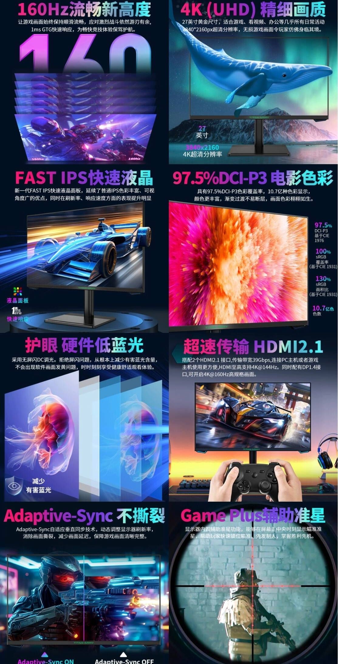 27 寸 4K 160hz fastips 1ms,硬件低藍光,100%srgb  97.5%p3 色域,支持分屏,亮度爲 300 尼特,