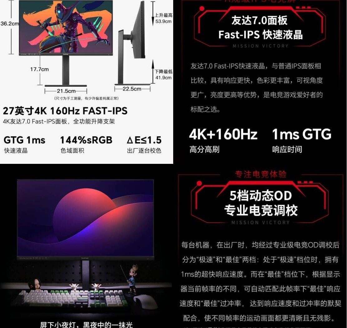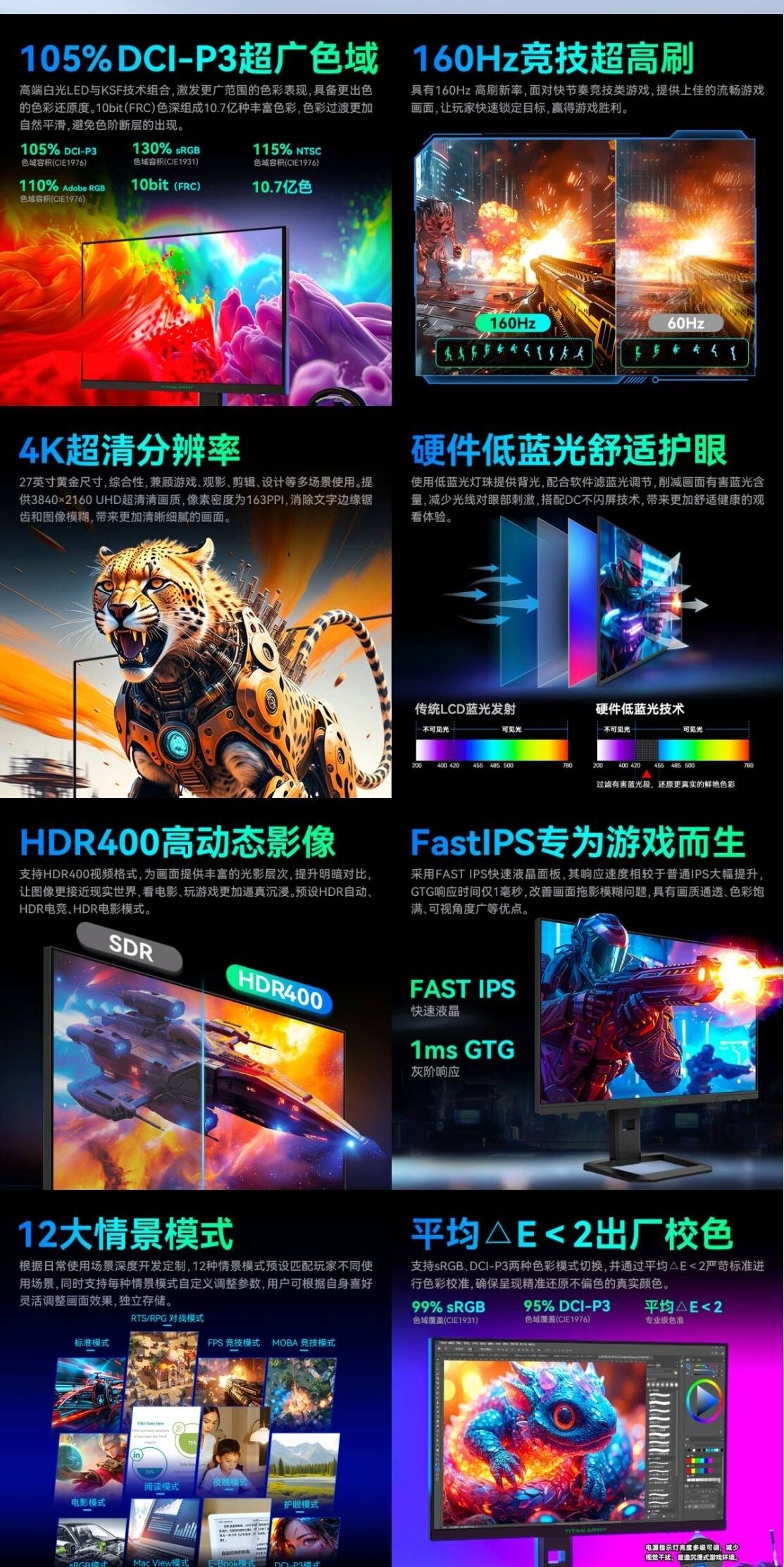 27 寸 4k 160hz fastips,支持低藍光跟分分屏,10bit 色深,100%srgb 99%p3 色域,色準<2, 500 尼特亮度,支持 HDR500 。