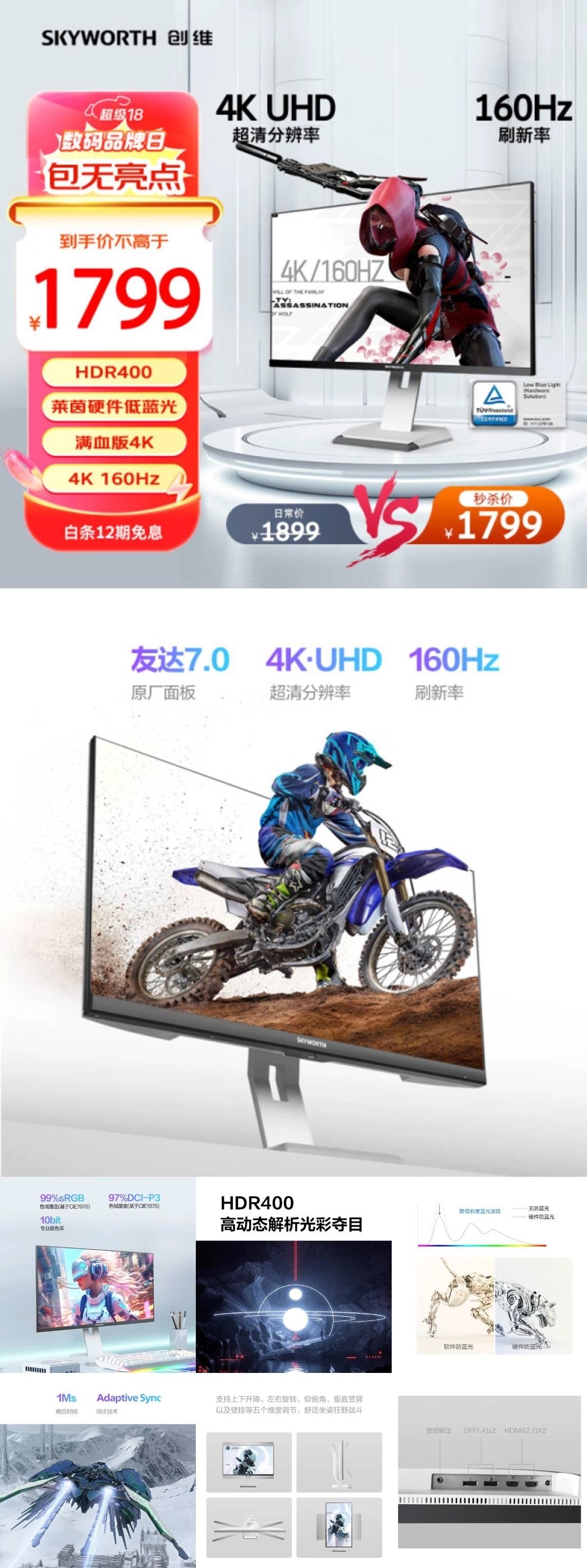 採用 fast ips 友達 7.0 面板,1ms,400 尼特亮度,擁有 10bit 的 98% 的 p3 色域。接口支持 2xhdmi2.1 跟 1xdp1.4,支持低藍光跟分屏顯示。