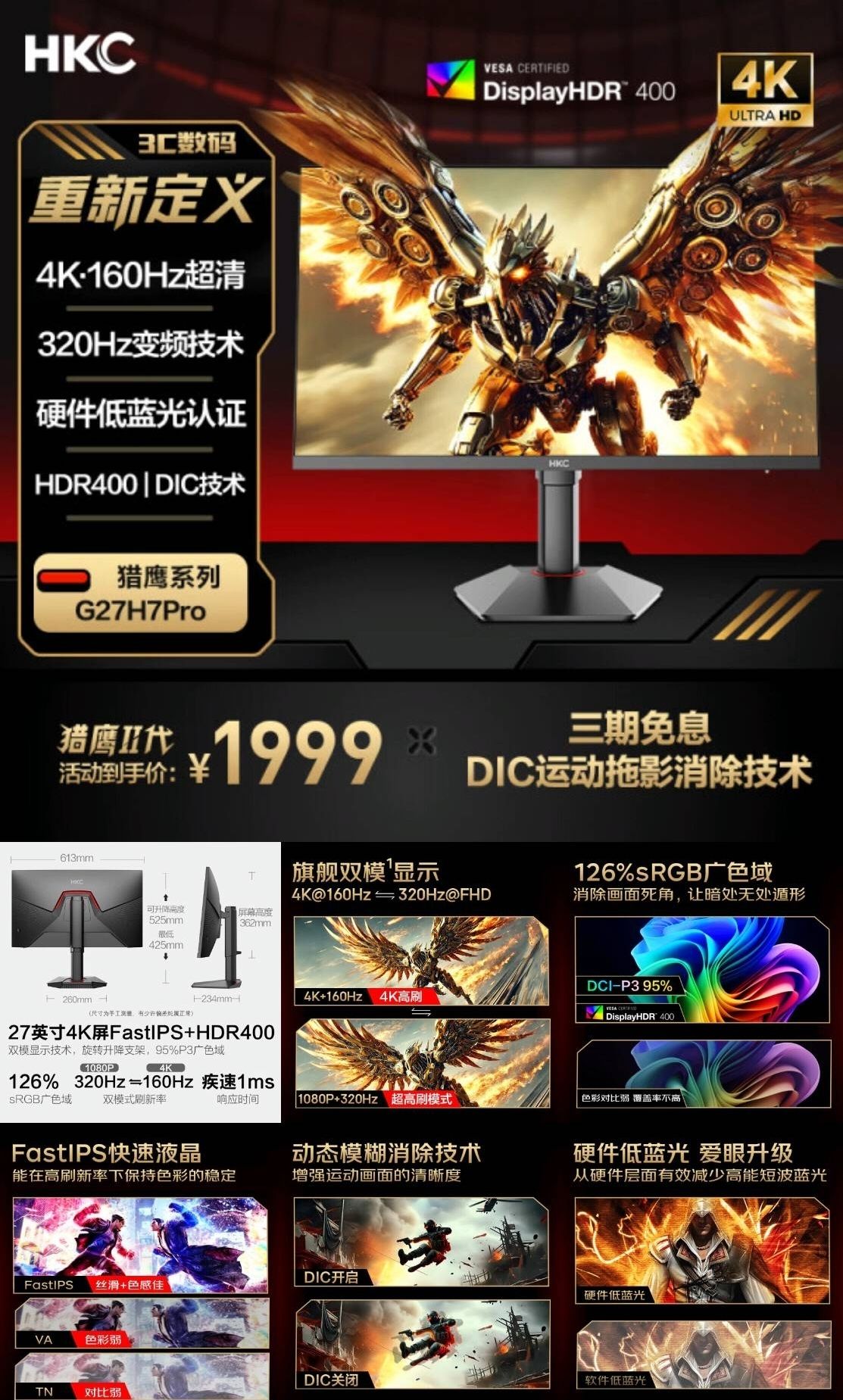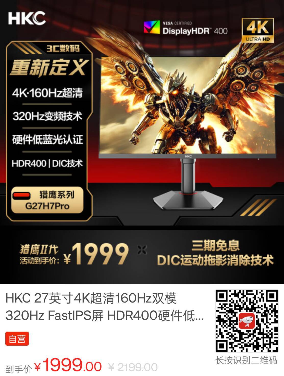 9:HKC 獵鷹 G27H7PRO 24 寸 4/2K 160/320hz 雙模
