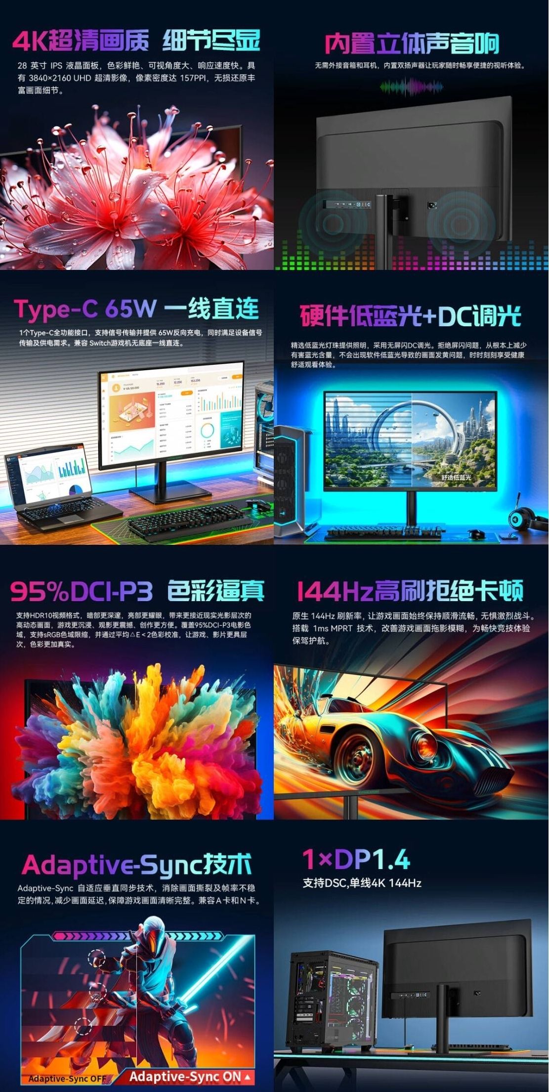 採用 ips 面板,99%srgb 95%p3 色域,1ms,支持硬件低藍光,色準<2, 但是隻有 300 亮度,支持分屏