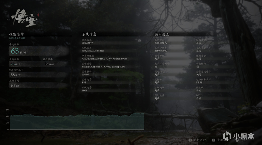 2.5K 超高则平均帧率降到63帧/秒,最低低过了60,只有56帧。也还是同样可以流畅玩。就是天命人心里有时候会犯膈应。还能给自己找个有点卡的借口!