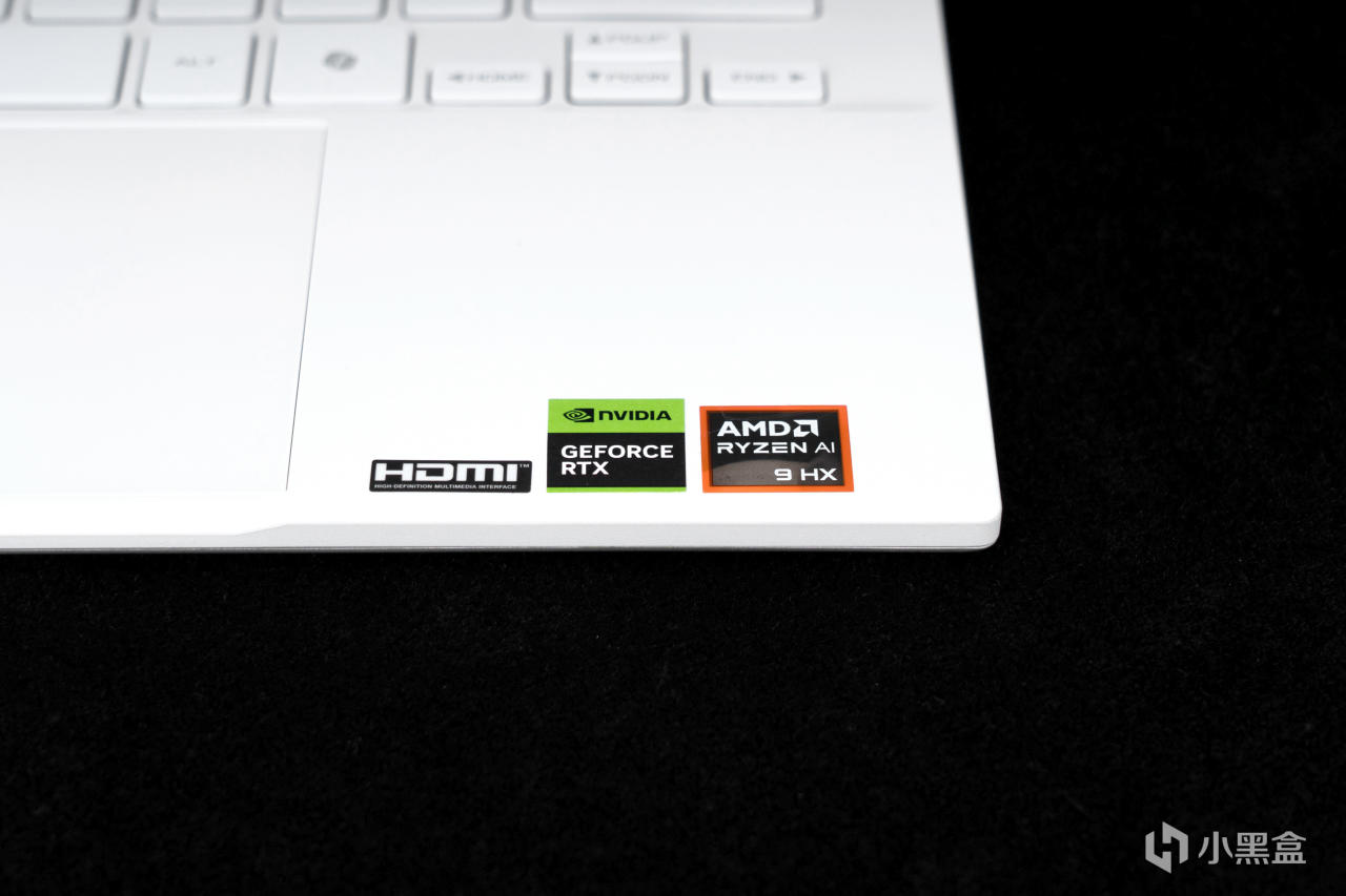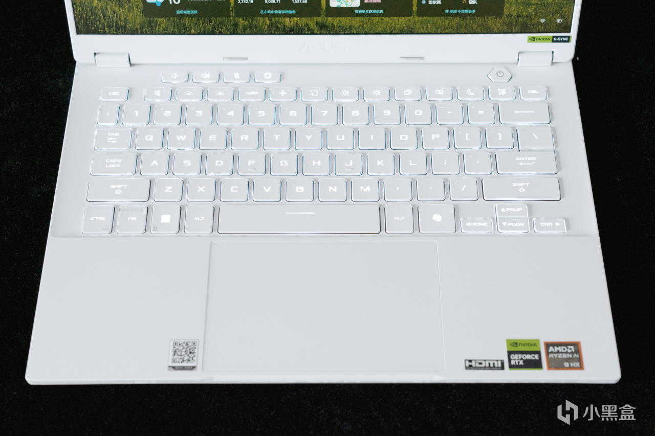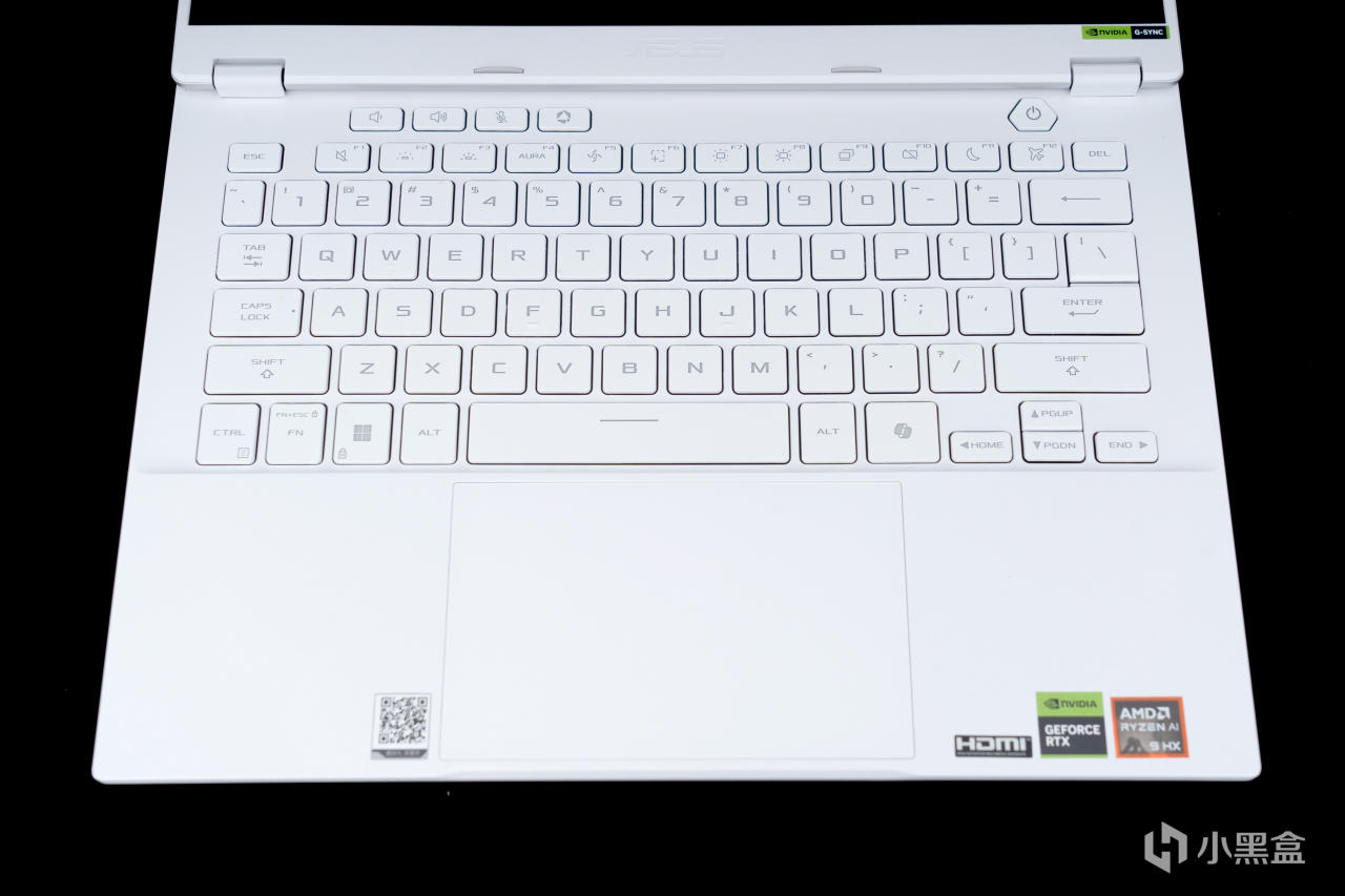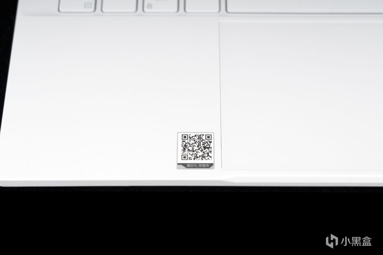 近似无边框触控板的规模也比较大,几乎占满了掌托的高度。实际使用起来,触感也非常不错。两侧分别是华硕服务的二维码和红绿CP+HDMI的贴纸。