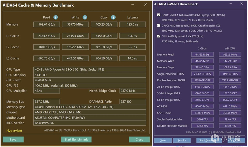 AIDA64的内存测试现在看简直就是LPDDR5x 7500秀肌肉的舞台,默认开启的安全虚拟化造成的不出意外延迟虚高,但是带宽数值确实相当惊人,GPGPU是混合模式下跑得,仅供参考。