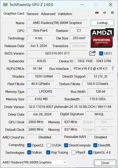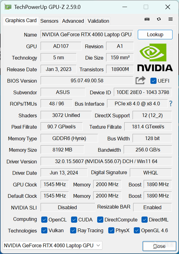 看完了CPU,来看GPU-Z,独显是RTX 4060 Laptop,AD107,8G显存。最大供电100W,毕竟是轻薄全能本,没有满血也正常,而且这个功耗足够发挥4060的九成功力了。