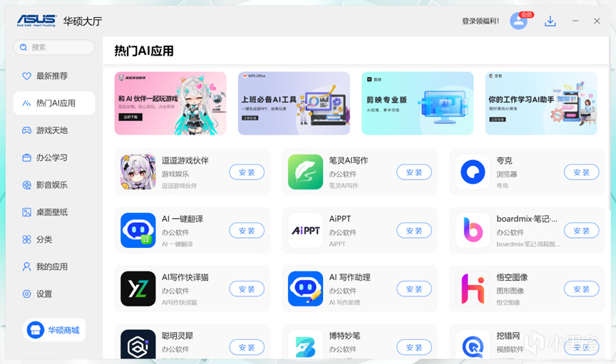 另外两个MyASUS和华硕大厅就分别是“优化大师”和“软件市场”指向性的,三位一体,形成了自带软件控制体系。
