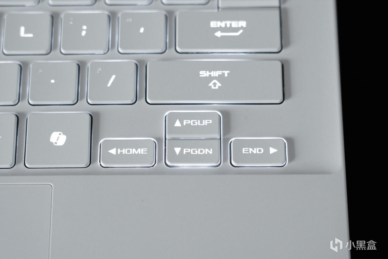 除了常规的键盘外,F1-F5的上方还设定了4个功能键,分别是音量加减、麦克风开关和奥创的呼出键。苛刻地讲,实际上应用场景不多,如果能搭配奥创自定义功能键位的话相信作用肯定更大一些。键盘的手感上有一定回馈的呈现,有明显的段落感,按压在笔记本里算是比较过瘾的,这和B面留出的垫高相呼应,当牛马的幸福感也强一些。