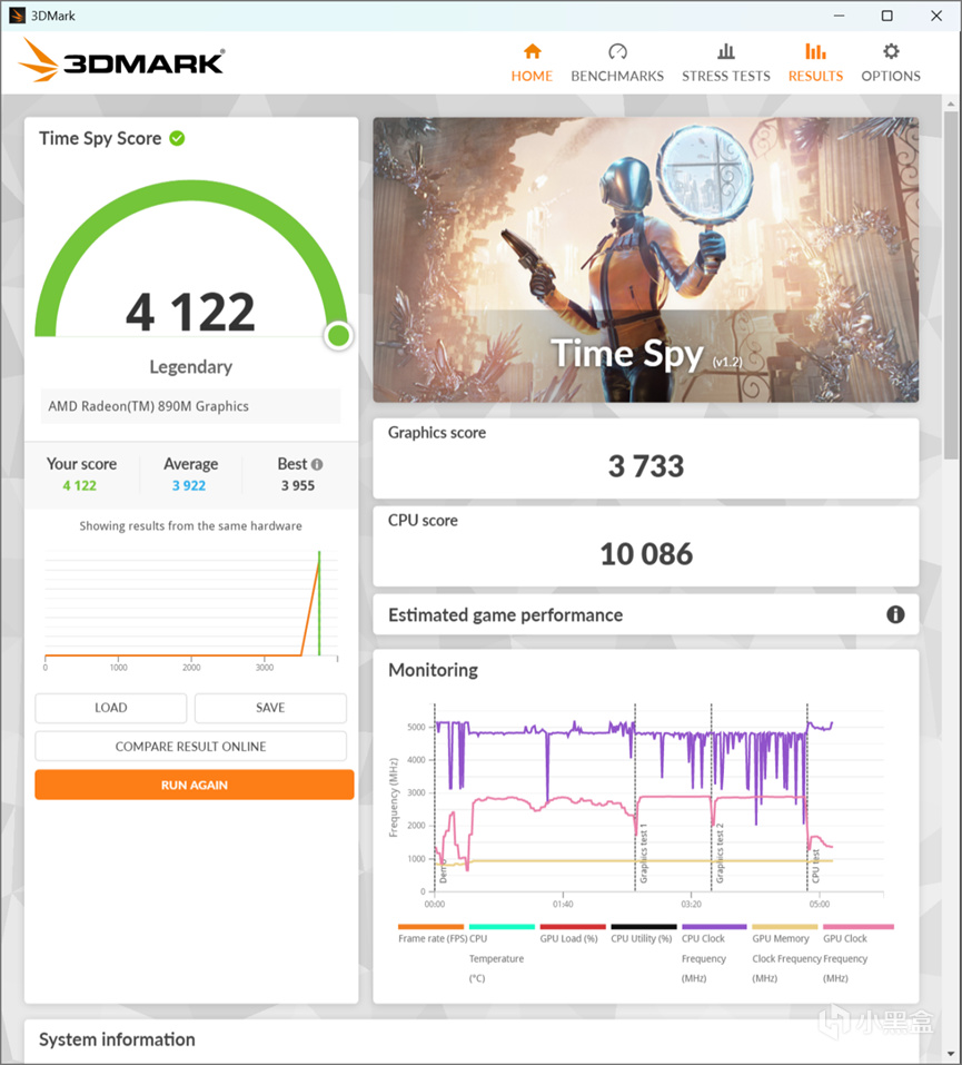 TS得分超4000,CPU破一万,Graphic 3733。从监视器能看出,CPU和集成显卡整个测试全程几乎都维持在最高频率运行。