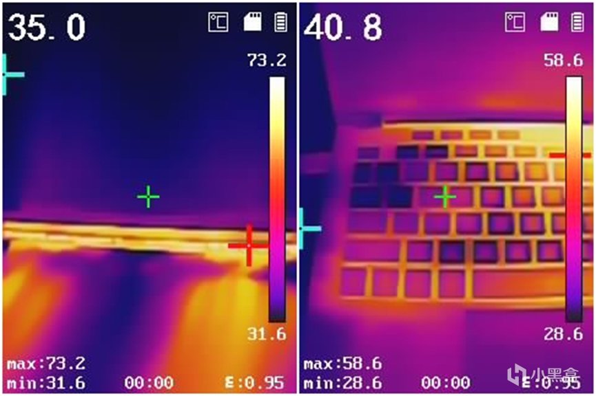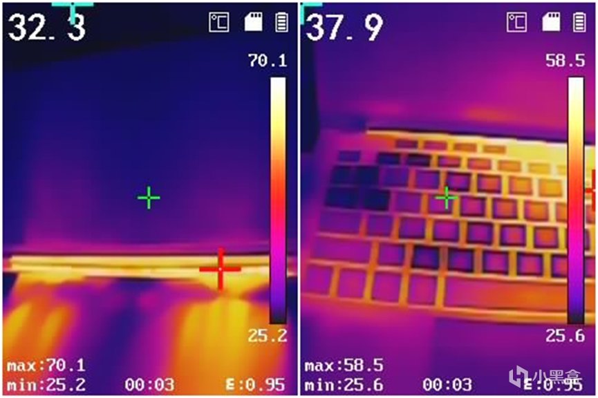而此时,屏轴处温度不变的情况下,尾部和WASD键盘区温度明显提升,这也是目前轻薄本的共性问题了,物理法则无法违背啊!