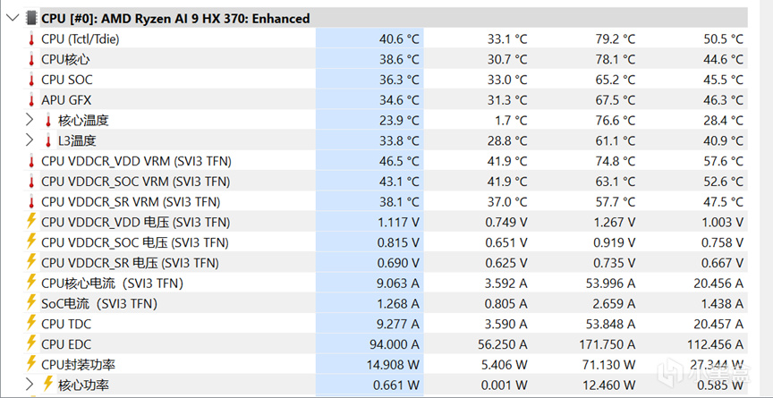 测试期间,通过HWINFO观察,CPU温度在80℃上下,封装功率在70W左右,可以说令人震惊,成绩相较85W的锐龙7 8845HS参照组,都有20%~30%的领先,这里可以说是遥……