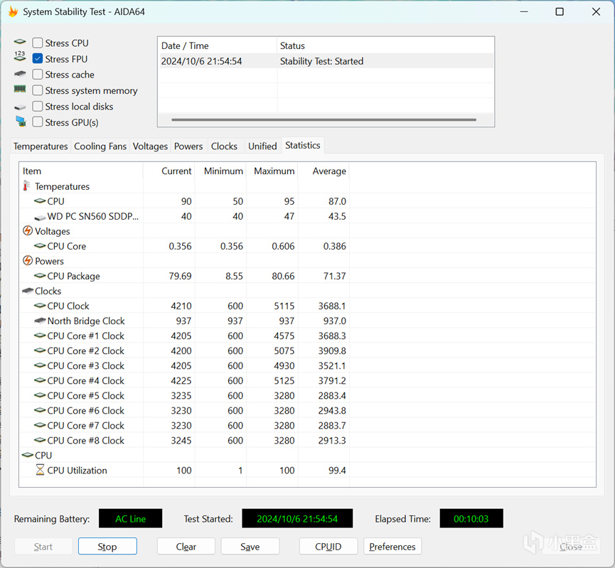 插电烤机测试,单烤FPU 10分钟,CPU供电居然还能稳住80W,属于是标着上限在跑,此时ZEN 5核保持在4.2GHz,ZEN 5c核主频在3.2GHz左右,温度90度,测得分贝数49分贝左右。这主频和温度确实恐怖!