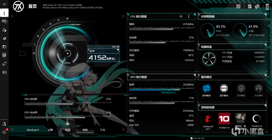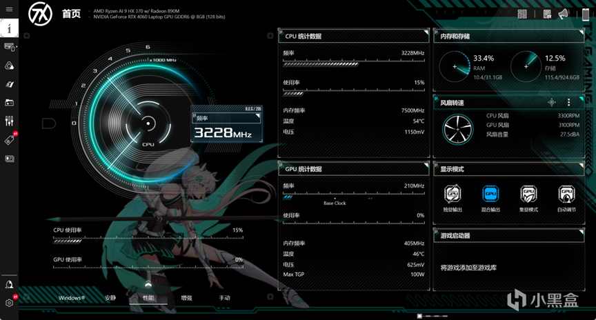 先必须介绍一下植入在系统中的奥创,这次的奥创一改之前反人类的感觉,提供超多实用功能,首页上可以直接进行显示模式的切换,掌握目前机器的运行状态和运行温度。底部可以快速调整运行的能效模式。虽然总功耗只有110W,但是性能调配上调教的非常合理,后面会提到。