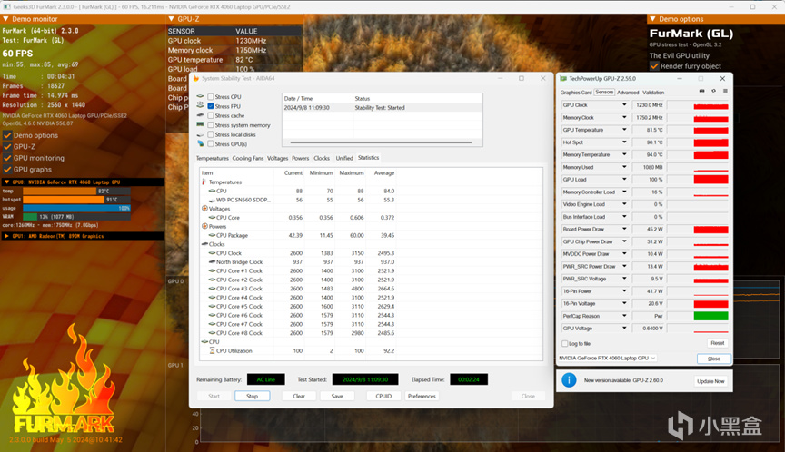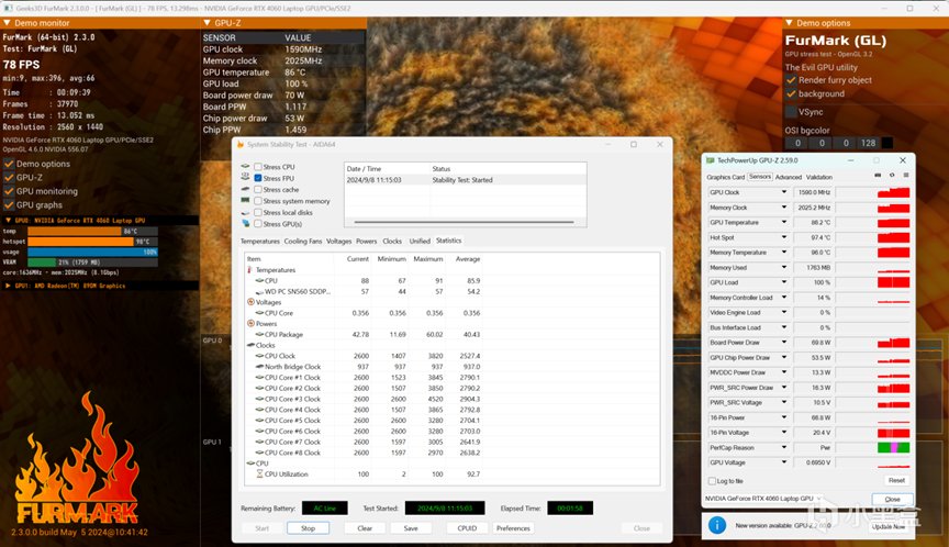 混合模式Furmark 2.3.0.0,2K模式轻松跑到80FPS,现在Furmark实际离游戏参照已经越来越远了,只能说占用冲个满,此时显卡温度80左右。