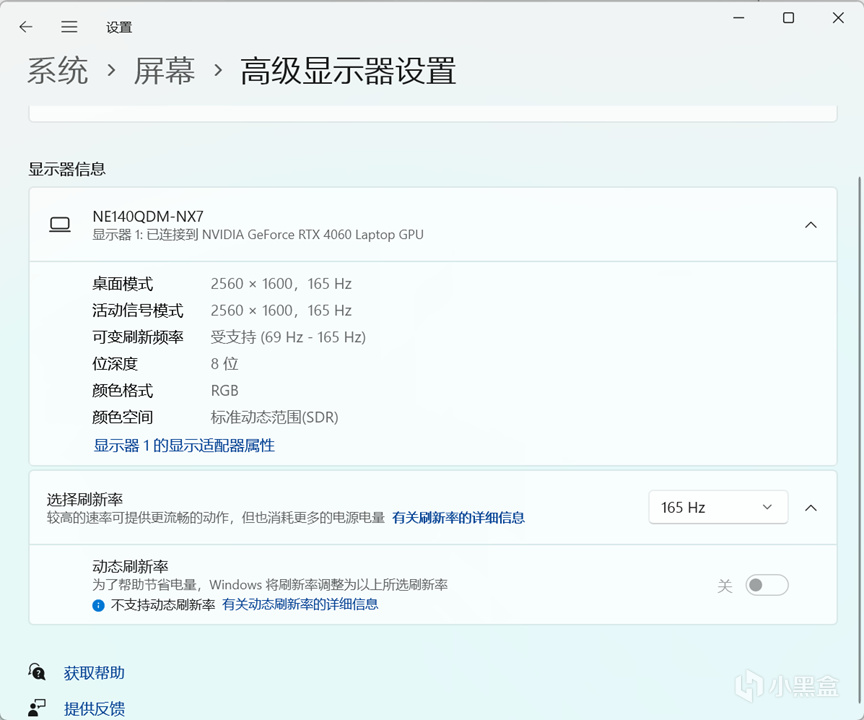屏幕是是来自国内巨头京东方BOE的16:10高分辨率高刷屏幕。2560×1600 165Hz支持可变刷新率。但是要注意,在集显模式下并不支持可变刷新率,如果要提升离电续航,建议手动调节至60Hz。