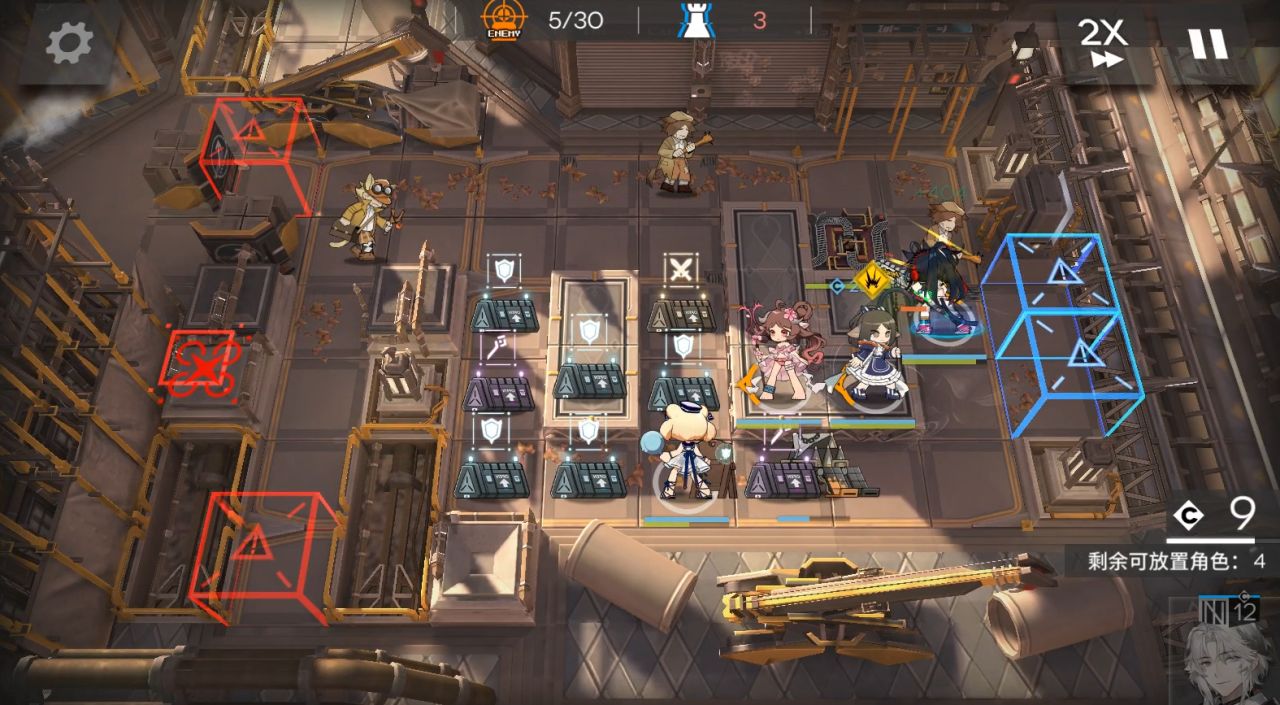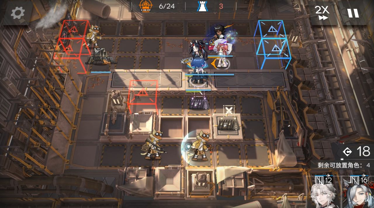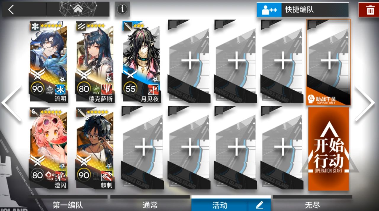 堵門速刷,依次部署先鋒右下角打掉2個小兵,棘刺朝左,流明朝左,粉毛朝左,月見夜朝左掛機(可以往左一格,漏掉的小怪德克薩斯打)。