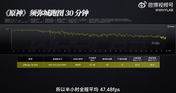 在《原神》須彌城跑圖測試中,搭載A18 Pro的iPhone 16 Pro前段測試能接近滿幀,但後面就開始掉幀,最終的平均幀率是47.48fps。