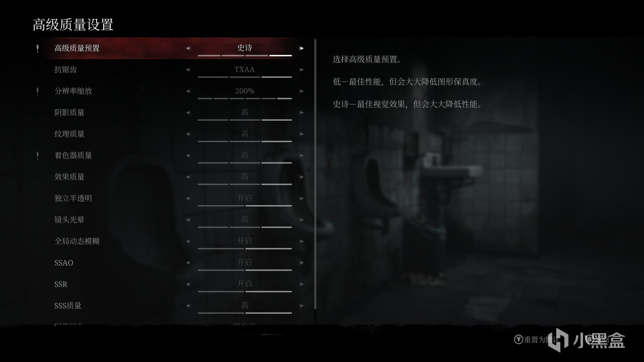 《寂靜嶺2重製版》擁有低、中等、高、史詩四種預設畫質方案,有實時對比畫質的設計,可惜僅限於整體預設,幷包括單獨的選項。遊戲場景並不宏大,大部分室內區域更是可以用狹窄來形容,具體到選項數量也提供到13個,除了常規選項,也有獨立半透明、次表面散射這些細緻選項,原生抗鋸齒默認是TXAA,也可選擇FXAA,屬於目前主流遊戲常駐搭配。