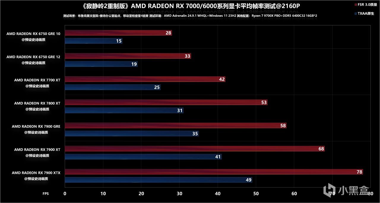 4K分辨率,性能需求劇增,原生抗鋸齒即便是RX 7900 XTX這種旗艦,也無法達標60fps流暢水平,都要開啓FSR進行輔助。個人建議:至少配備RX 7800 XT級別纔可暢玩4K,RX 7900 GRE會進一步拉大差距,接近60fps標準顯然性價比更高,如果想遊戲全程穩妥流暢,那還是得RX 7900 XT或者RX 7900 XTX。