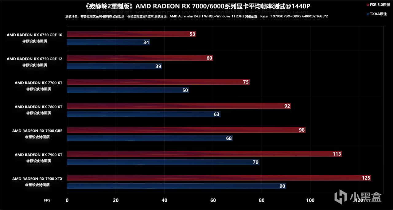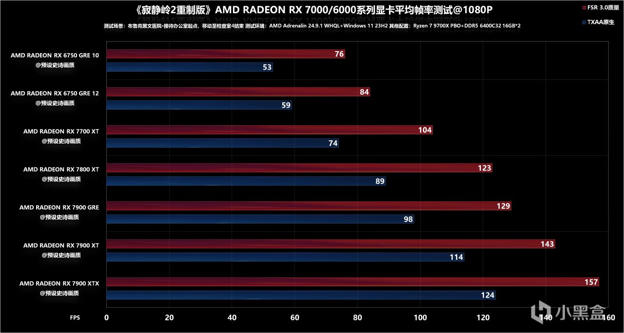 2K分辨率,原生抗鋸齒RX 6750 GRE系列已經應付不來,不過有FSR加持12GB版本還是能Hold住平均60fps水平,實際遊玩時也可以啓用平衡檔更爲穩妥,或者可以直接上到RX 7700 XT,畫面和幀數都能兼收。RX 7800 XT和RX 7900 GRE兩者差距在10%以內,有FSR輔助基本能達標高刷入門水平,求穩的話就得RX 7900 XTX這種旗艦卡了。
