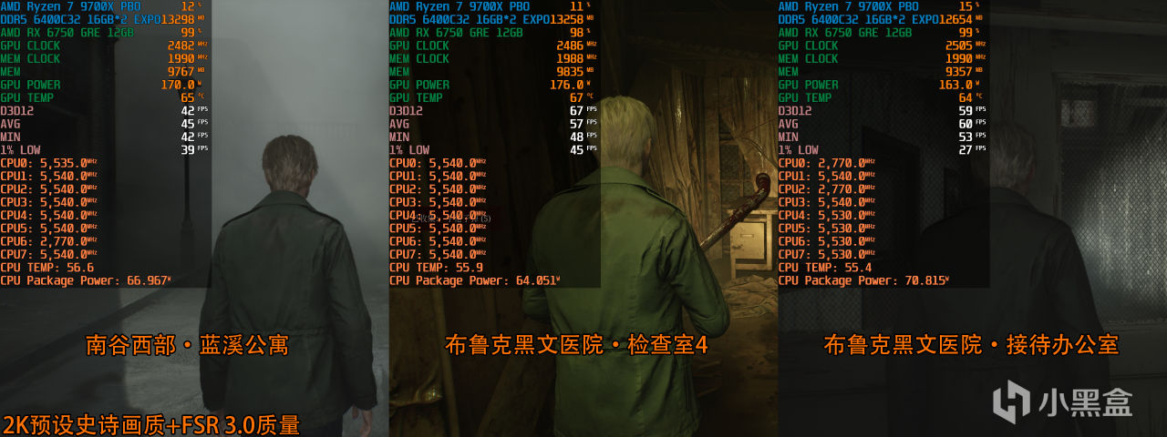 遊戲並沒有內置基準測試,硬核玩了大概9個小時,發現前四章存在一部分區域是帶迷霧的,此時幀數就會特別低一些(見上述RX 6750 GRE 12GB測試),不過幸虧遊戲大部分時間都在室內探索,所以這次測試選擇的是布魯克黑文醫院這個場景更有代表性,數據對比的是TXAA和FSR 3.0質量檔,若是遭遇到迷霧或者其他更復雜的場景,建議大家降至FSR 3.0平衡檔即可彌補性能差距,本身平衡檔性價比來說也是很高。