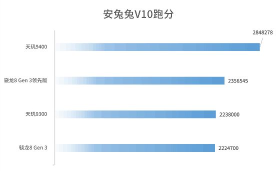 我們先看大家普遍關心的安兔兔V10版本跑分測試成績,在該項測試中天璣9400工程機得分爲284.8萬分,遠超當下所有安卓手機,再次打破了安卓手機性能天花板。