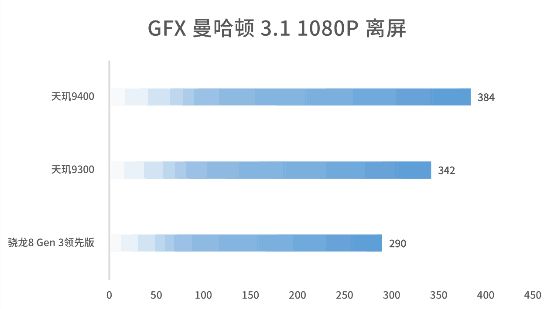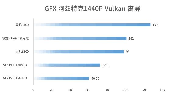 我們還跑了一下GFX曼哈頓3.11080P離屏測試,天璣9400工程機的成績爲384幀;GFX阿斯特克1440P離屏測試,Vulkan模式下成績爲127幀。