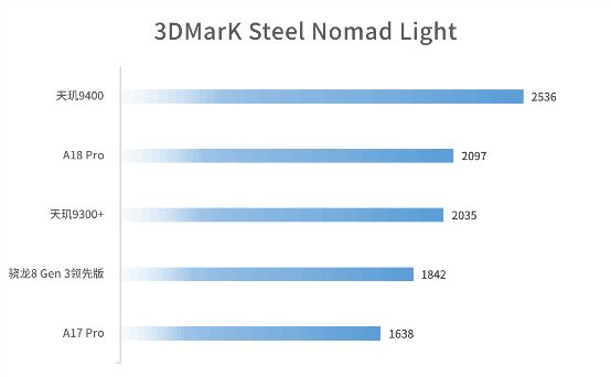 GPU方面可以說是天璣9400的優勢項目,在能夠反應當下主流手機遊戲性能需求的3DMark Steel Nomad Light測試中,天璣9400工程機的3DMark Steel Nomad Light得分爲2536分,遠超蘋果A18 Pro,並且領先優勢巨大。