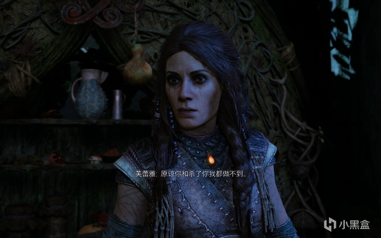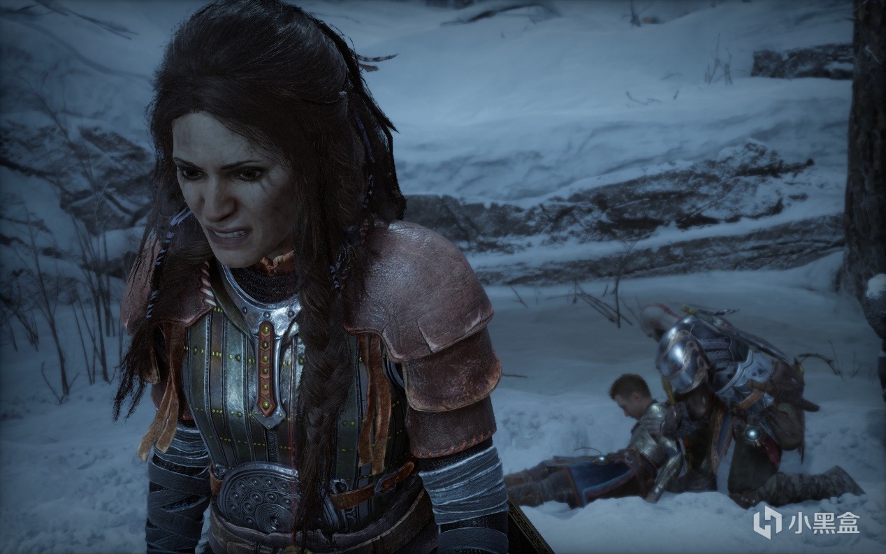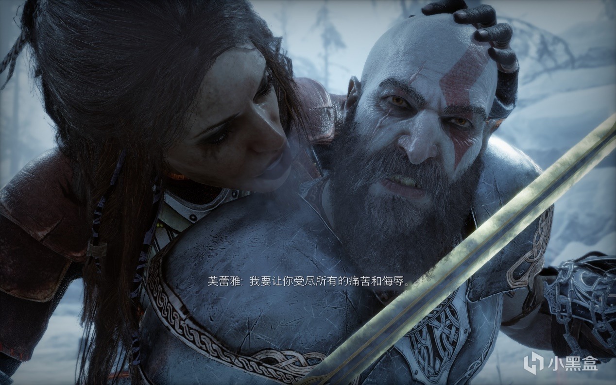 比如这一段,芙蕾雅仇视奎爷正要厮杀,阿特柔斯情绪失控变成了熊正要袭击芙蕾雅,奎爷推开芙蕾雅保护了她并且控制住了失控的阿特柔斯,说:“芙蕾雅是朋友,不是敌人。”这个时候芙蕾雅一句话都没说,但脸上抽动的表情已经暴露了她内心的动摇和矛盾煎熬。
