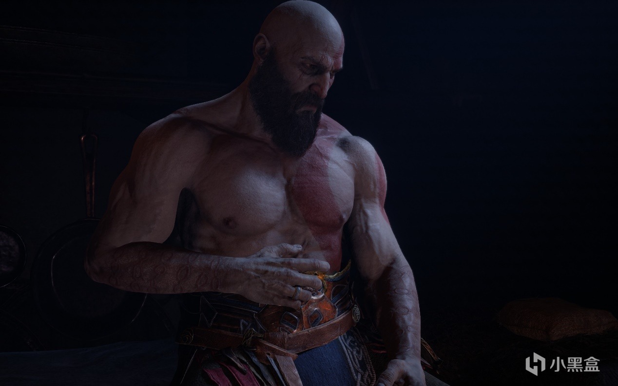 游戏里有一幕在房间里,奎爷随意地扔下武器,褪下自己的盔甲,身上满是过往的伤痕,双臂缠绕了铁链的勒痕,他躺在床上,森冷的月光与岁月的皱纹爬上奎托斯的眼角。