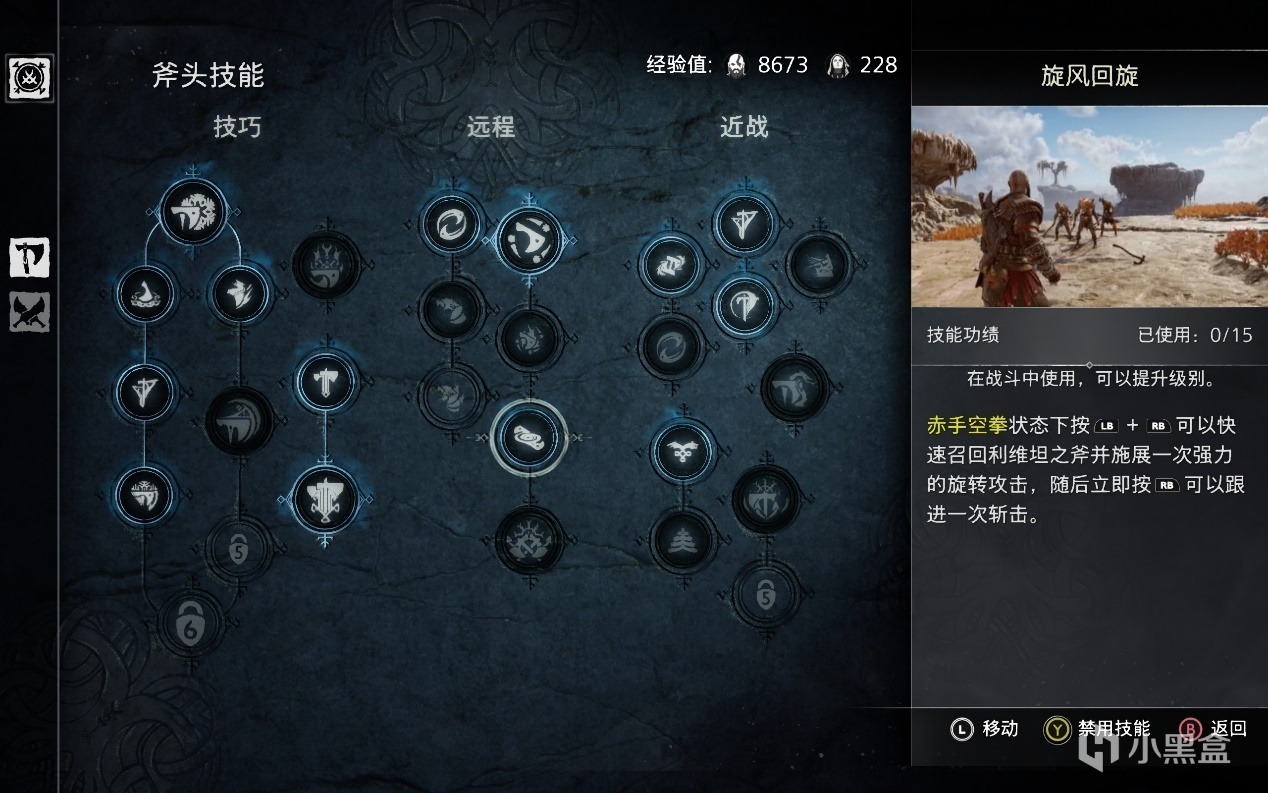 在丰富度上,游戏提供了3+1种武器,奎爷手持战斧双刀长矛,他的儿子则使用弓。每种武器可以用经验值去升级衍生动作及操作,玩到后期你会发现颇有格斗游戏搓连招之英姿。
